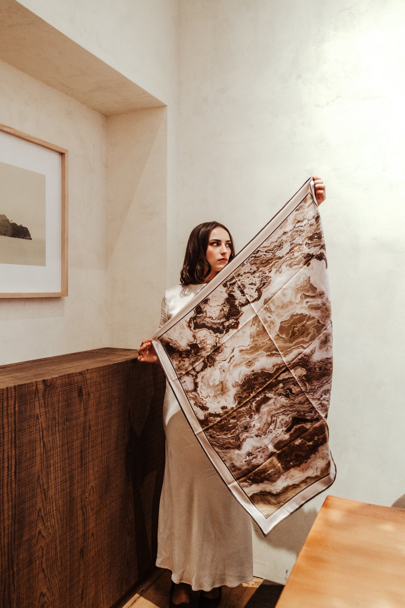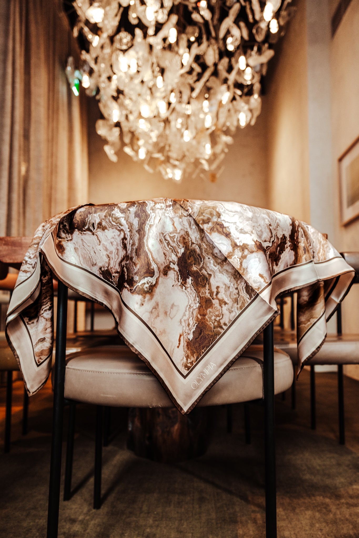 The Athena scarf showcases beautiful natural stone veining, in colours ranging from brown, beige and grey, through to fawn, cream and white. Perfectly on-trend and yet utterly timeless, this scarf will see you through many years to come