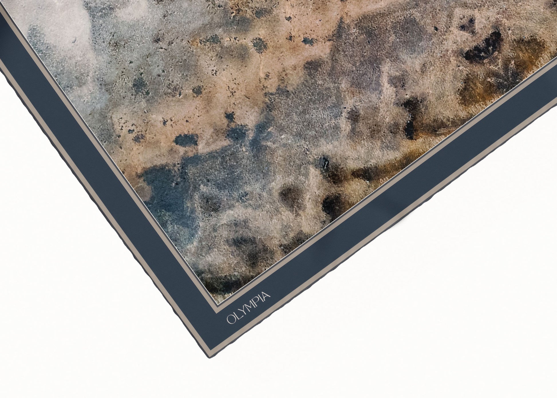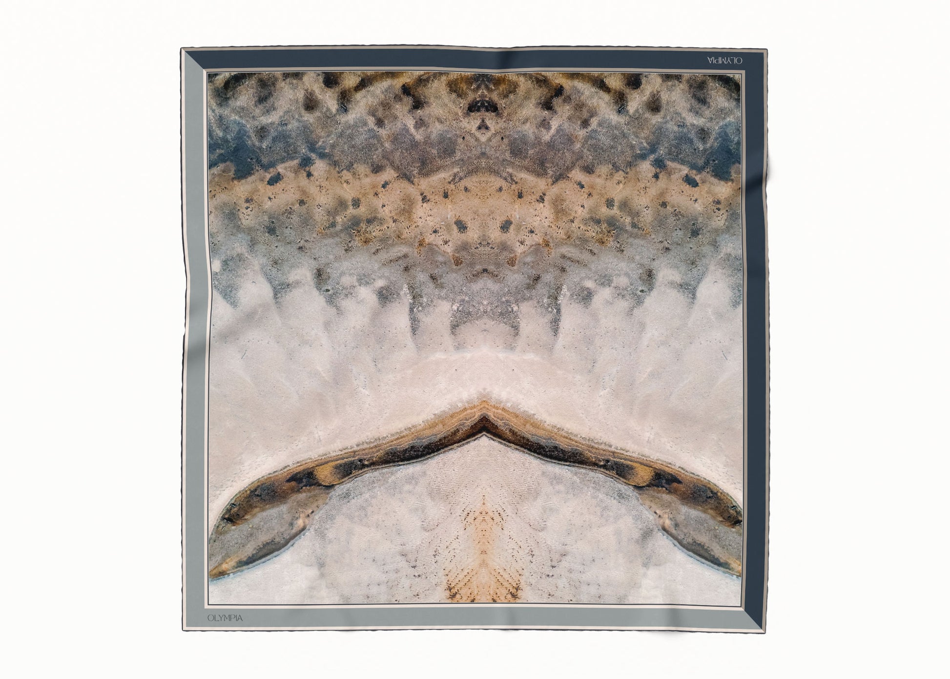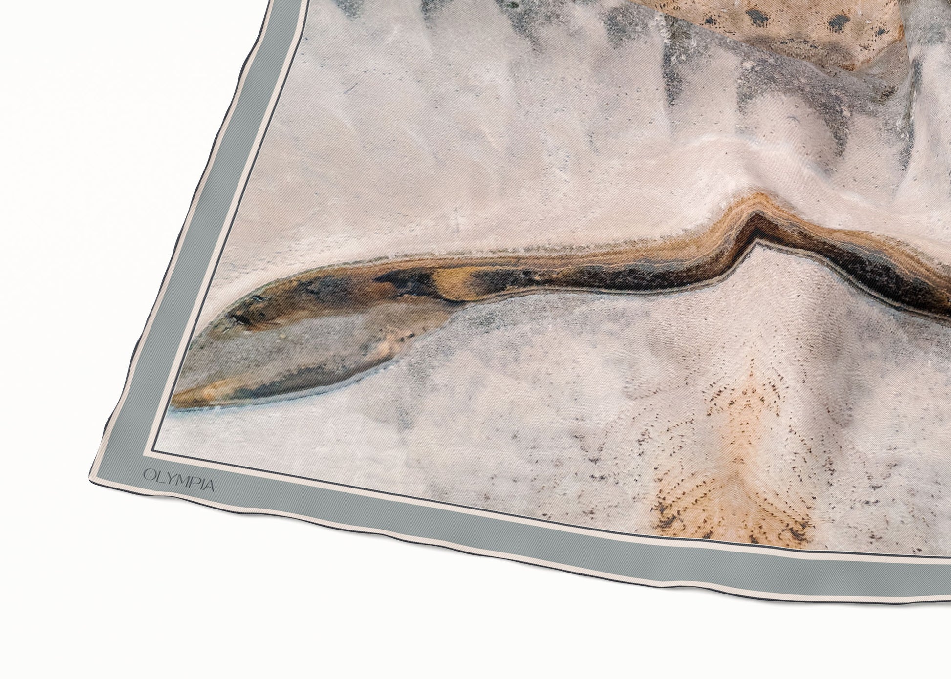 The Clemence scarf showcases an aerial view of a picturesque lake, with colours ranging from off-white, greys and beiges, through to blues, browns and black. One half of the scarf features predominantly lighter tones with a light grey-blue border - whilst the other half of the scarf features mostly darker tones with a dark blue-grey border. Perfectly on-trend and yet utterly timeless, this scarf will see you through many years to come