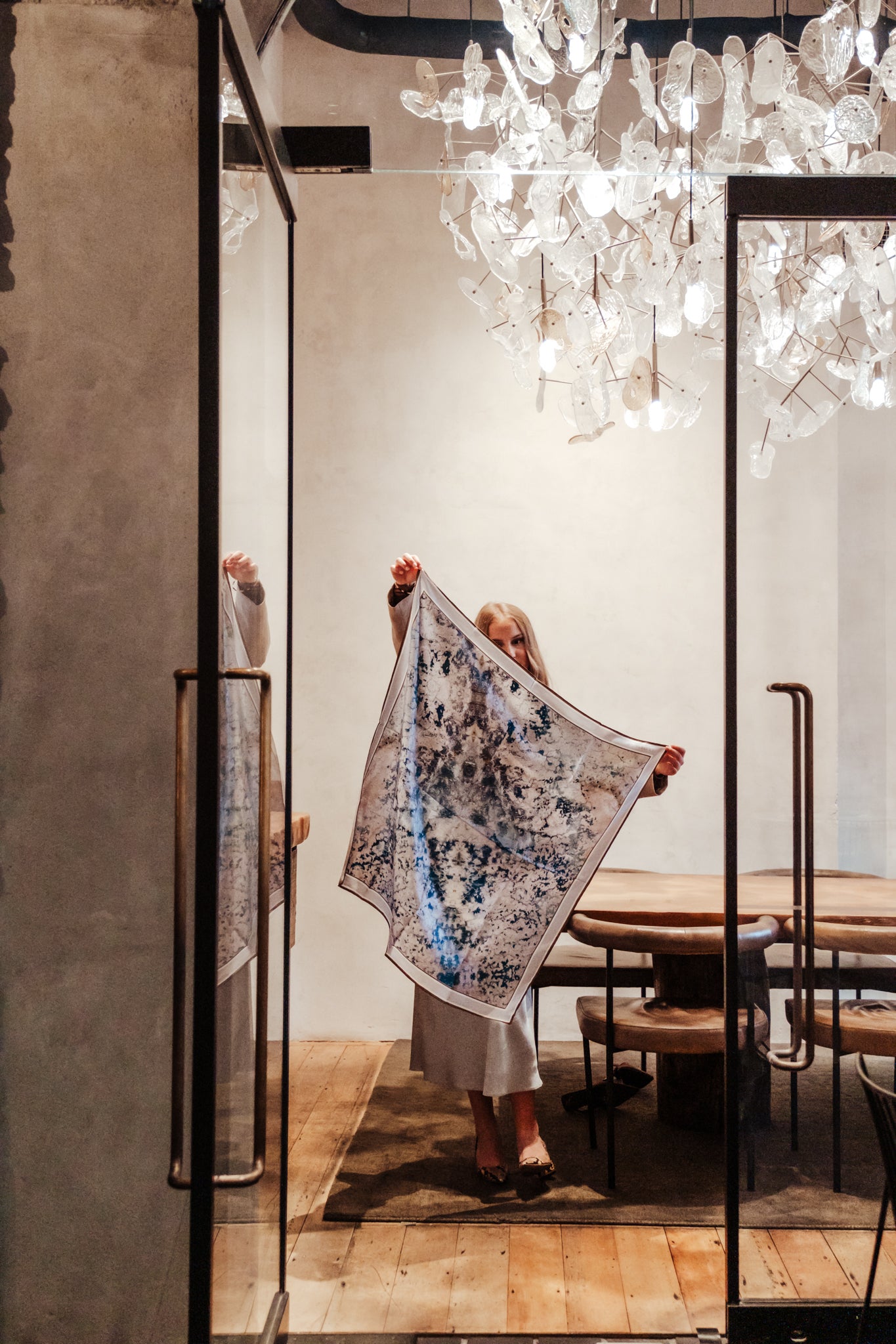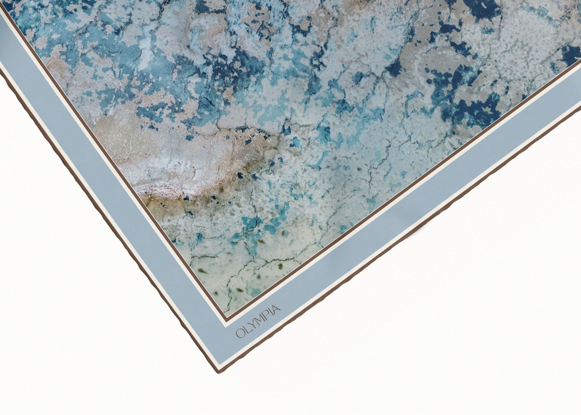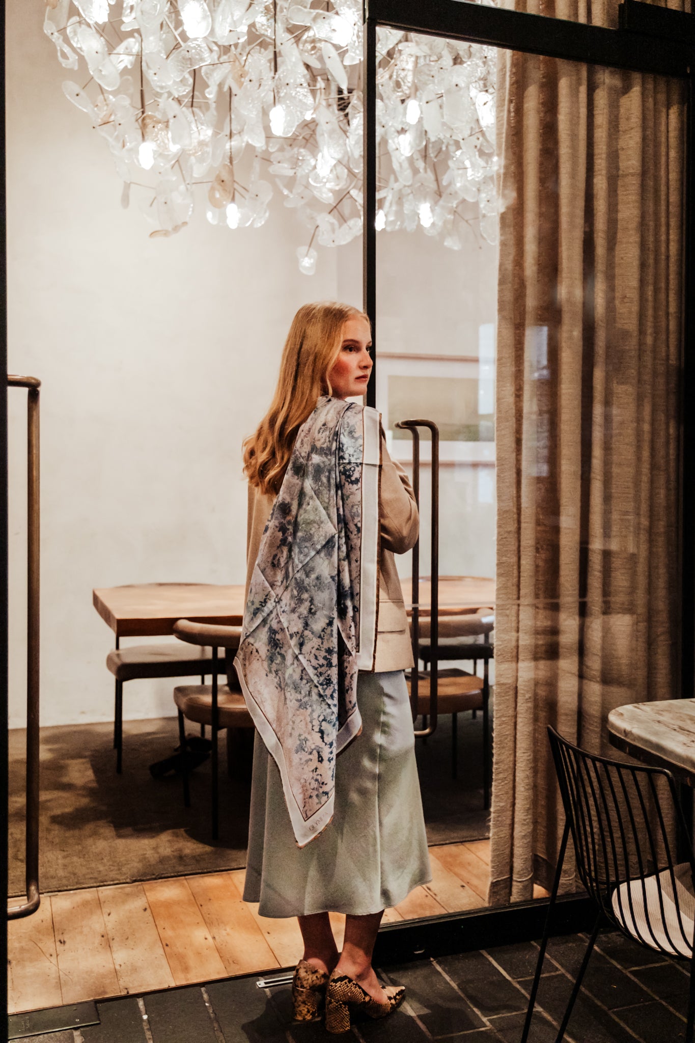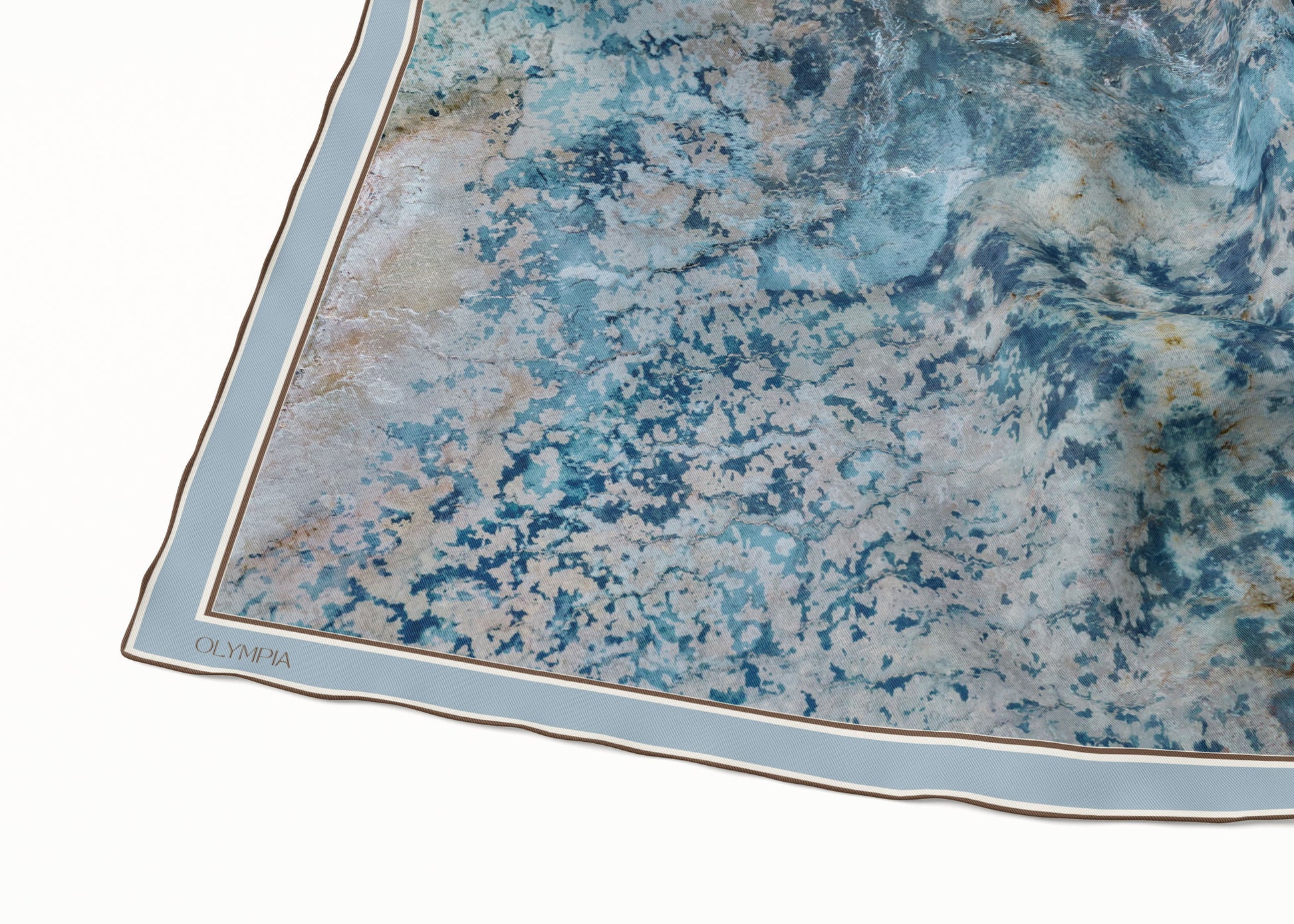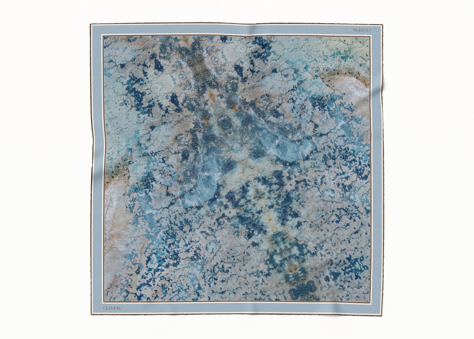 The Delta scarf features aerial photography of an Australian salt lake, with colours ranging from pale blue, dark bronze and teal, through to beige, grey and silver. The widest border is baby blue, framed by thinner borders in off-white and bronze. Perfectly on-trend and yet utterly timeless, this scarf will see you through many years to come