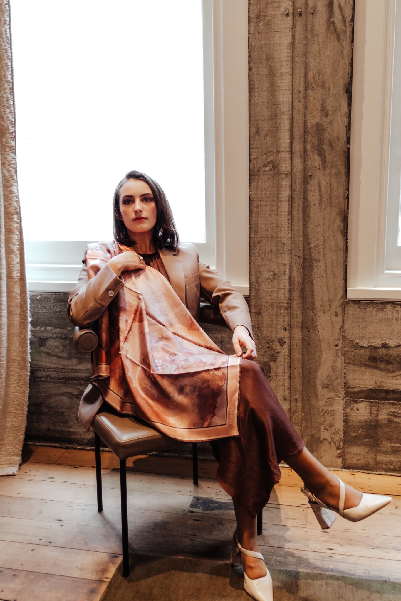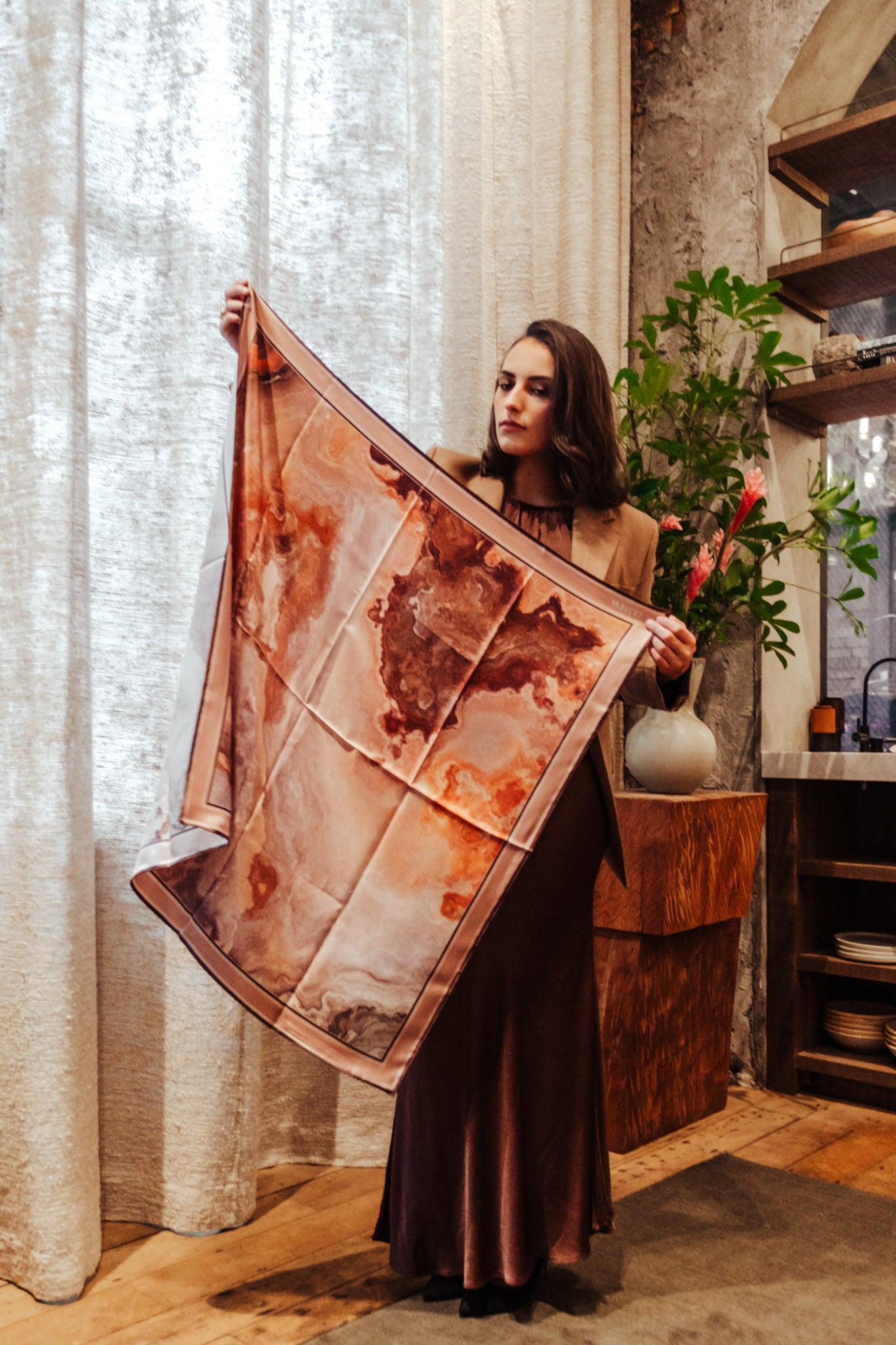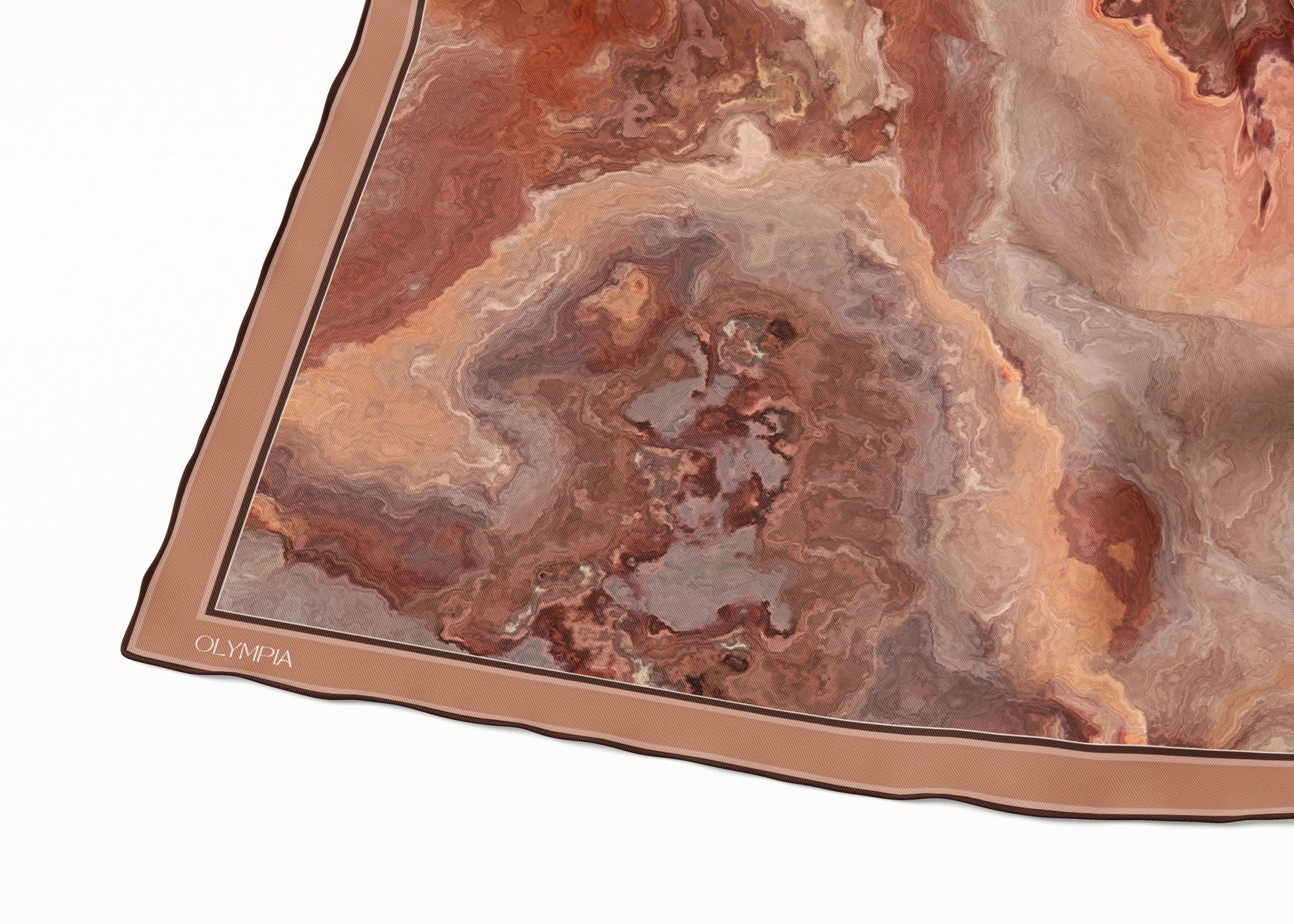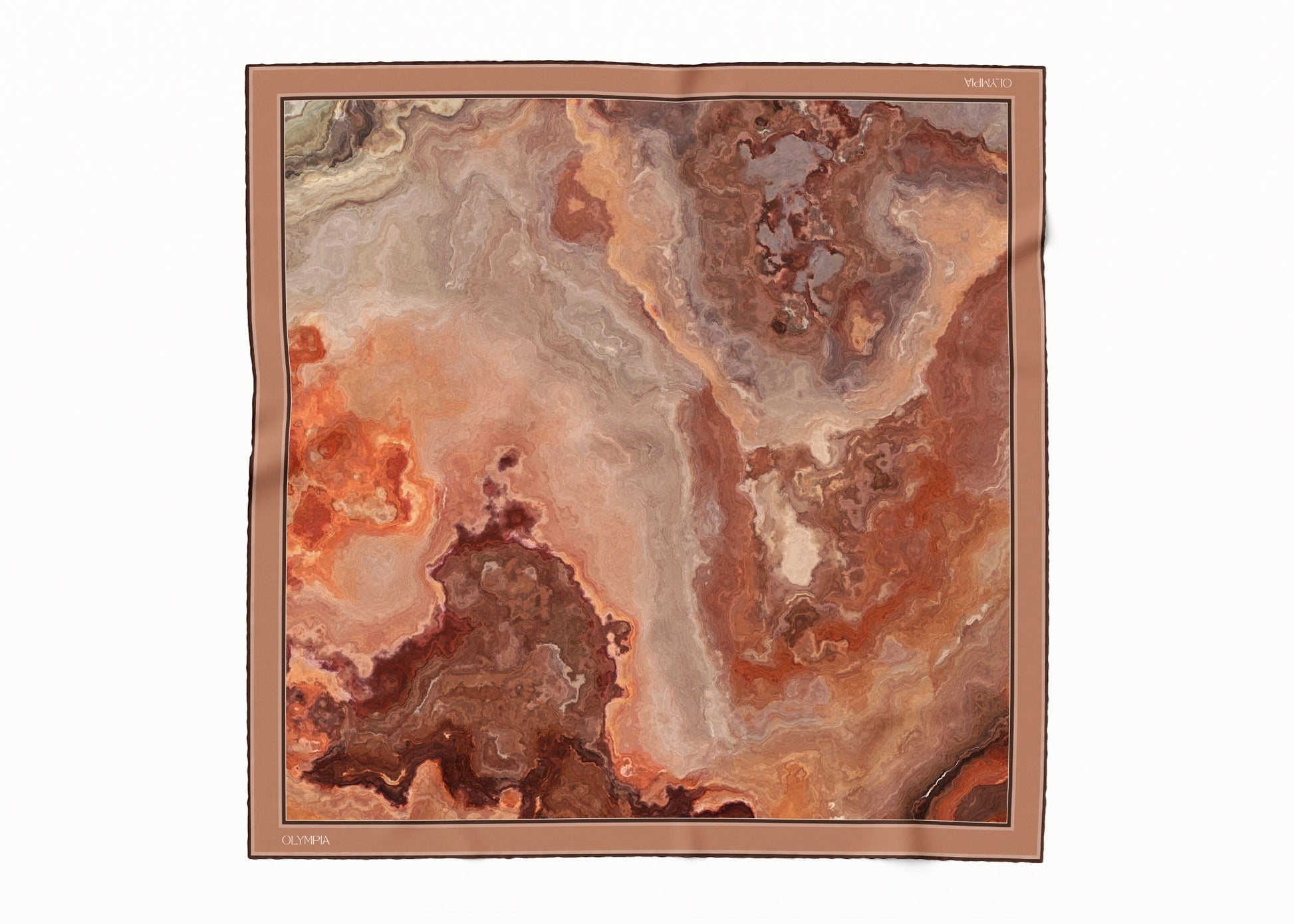 The Electra scarf features a print of beautiful natural stone veining, in colours ranging from smoky rose, light peach, mink brown and grey, through to pink clay, brick red, terracotta and chocolate brown. Perfectly on-trend and yet utterly timeless, this scarf will see you through many years to come