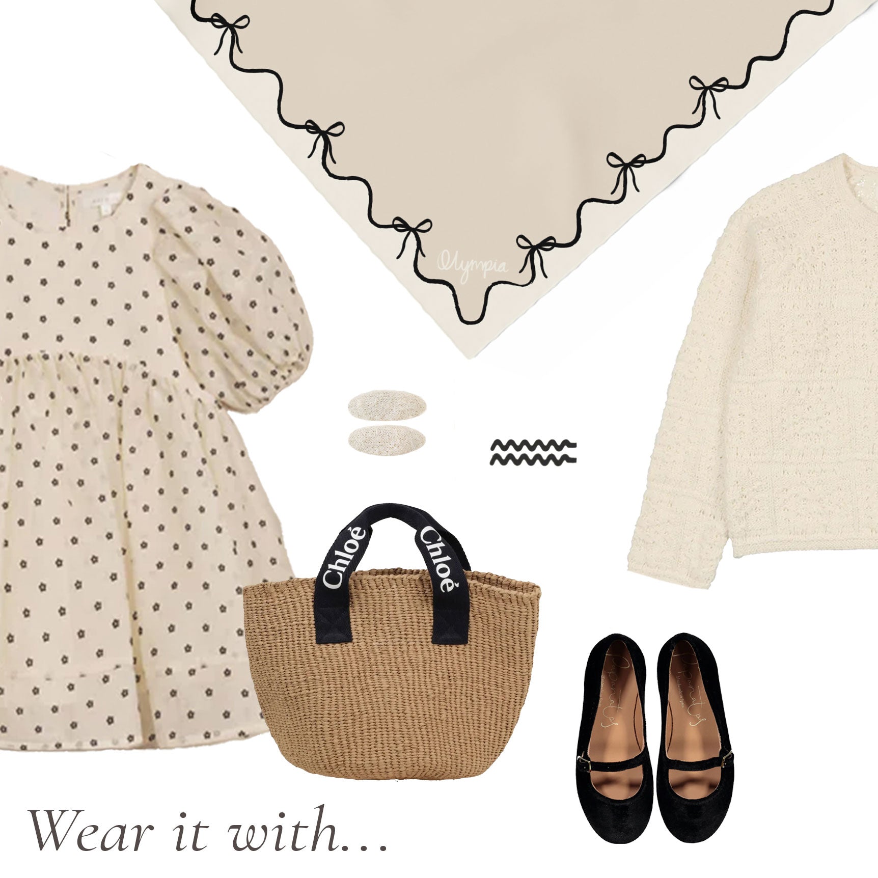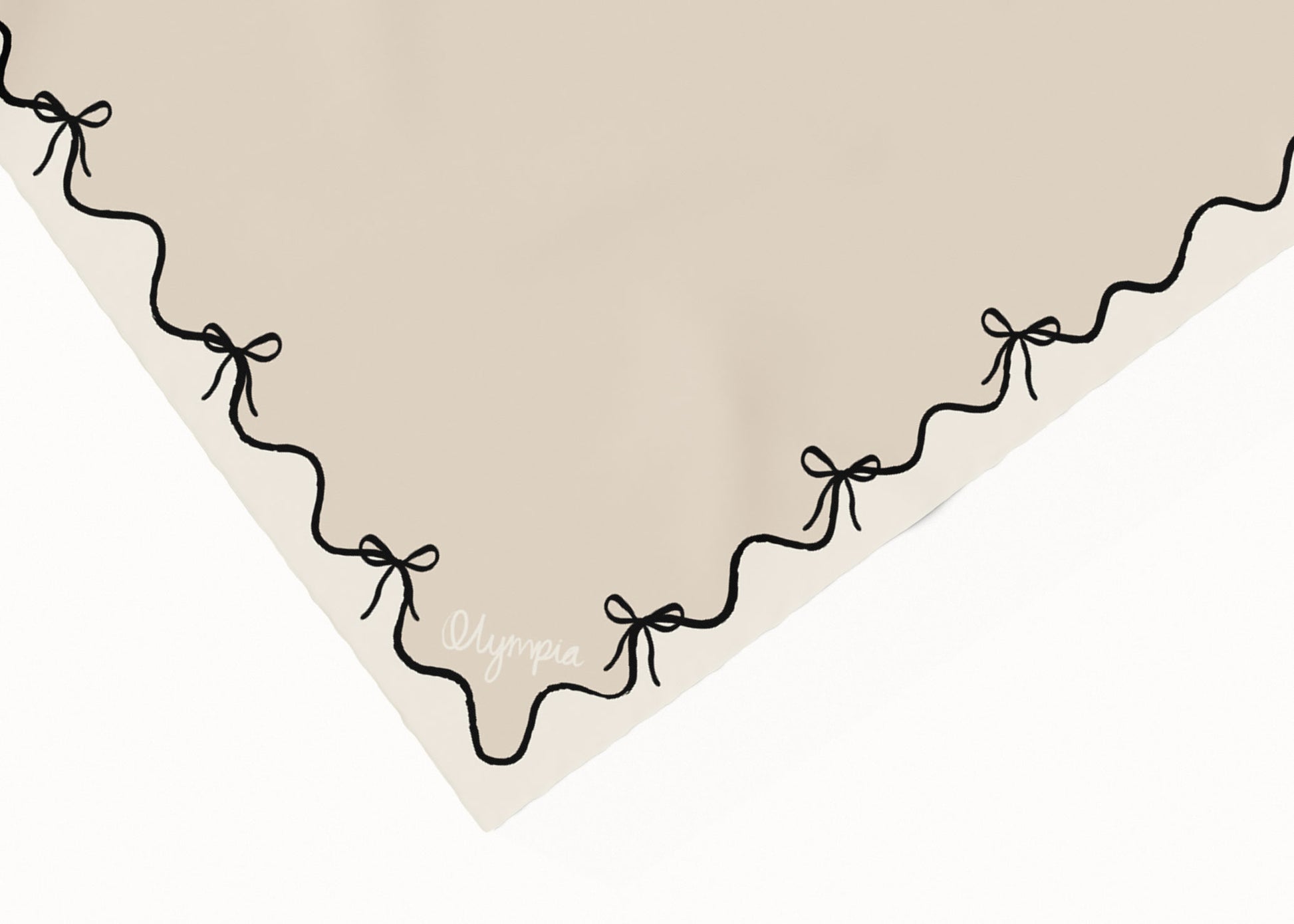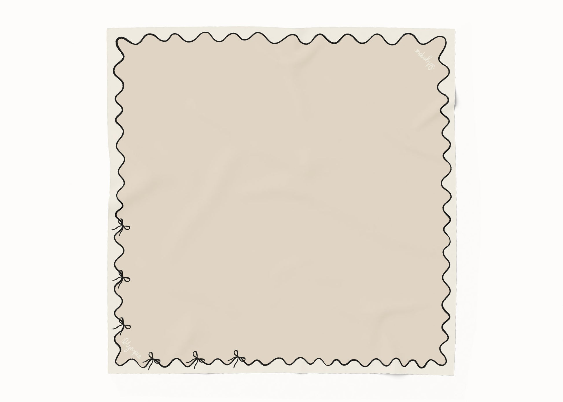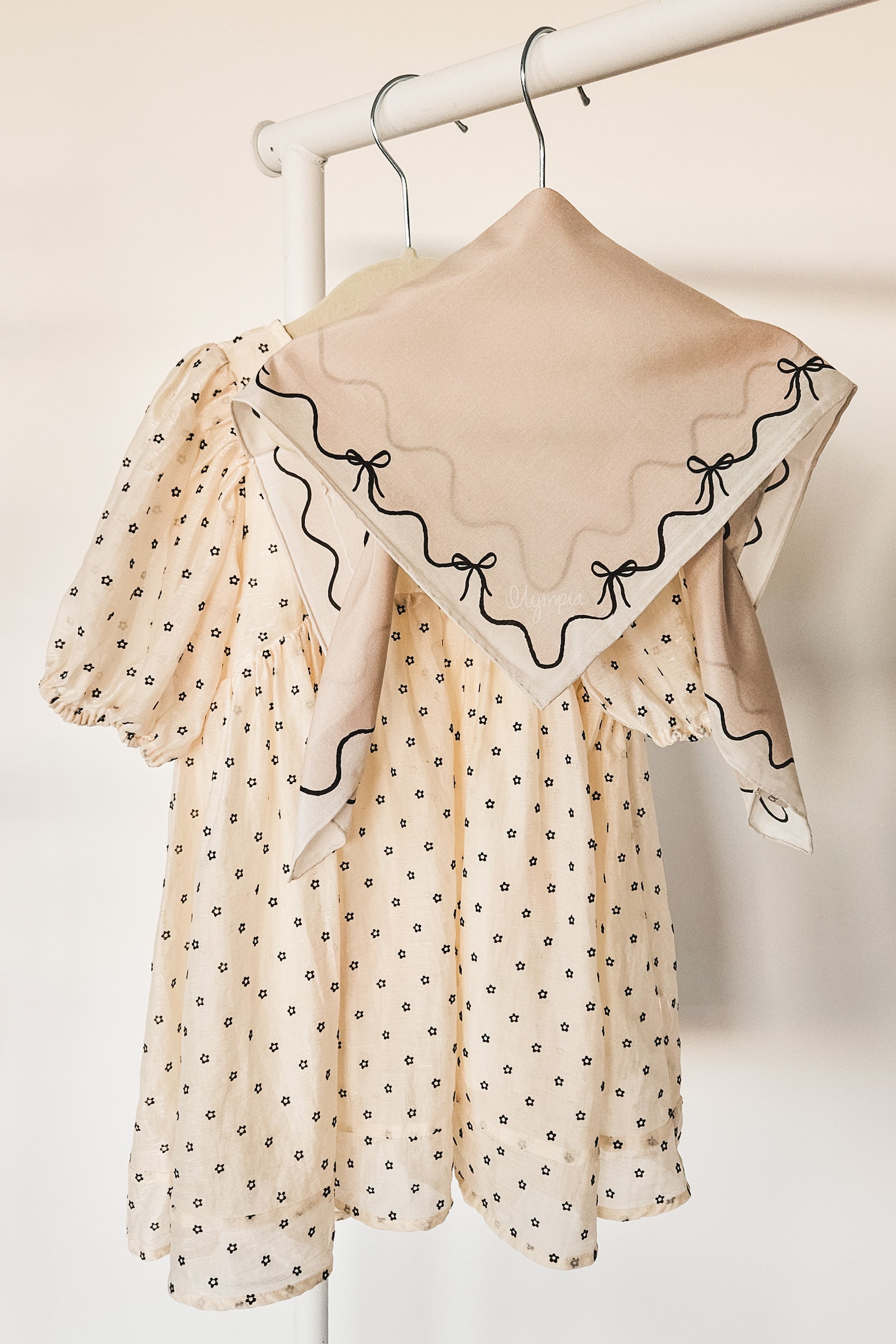 Introducing Emilia Bow- this scarf features the same hand-drawn look wiggly line border as our Emilia scarf, with the addition of adorable little bows on the border in one corner. Emilia is a gorgeous option to pair with sweet floral designs, making her perfect for little girls’ charming ensembles!