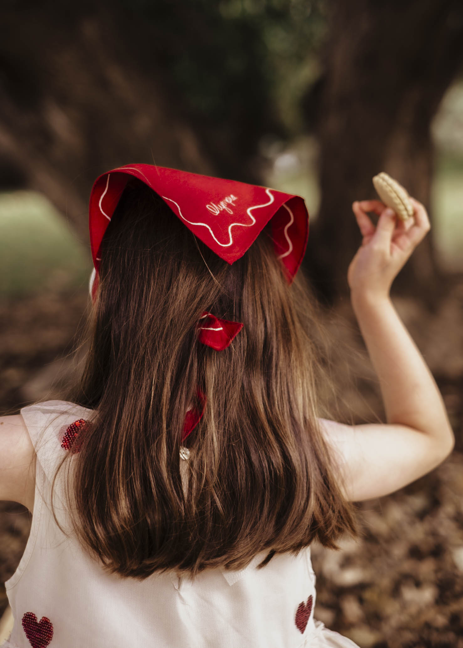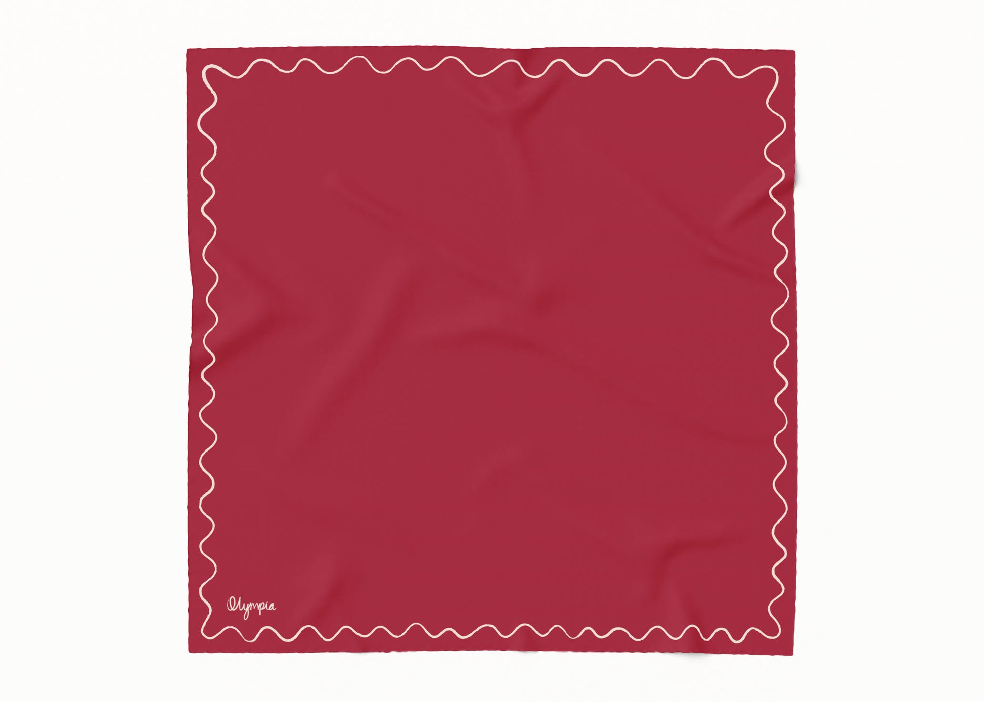 Background: A soft cool-toned medium red (for the most accurate colour please refer to the mockup images. The photos with the model in make the scarf look a brighter red than it is in real life)