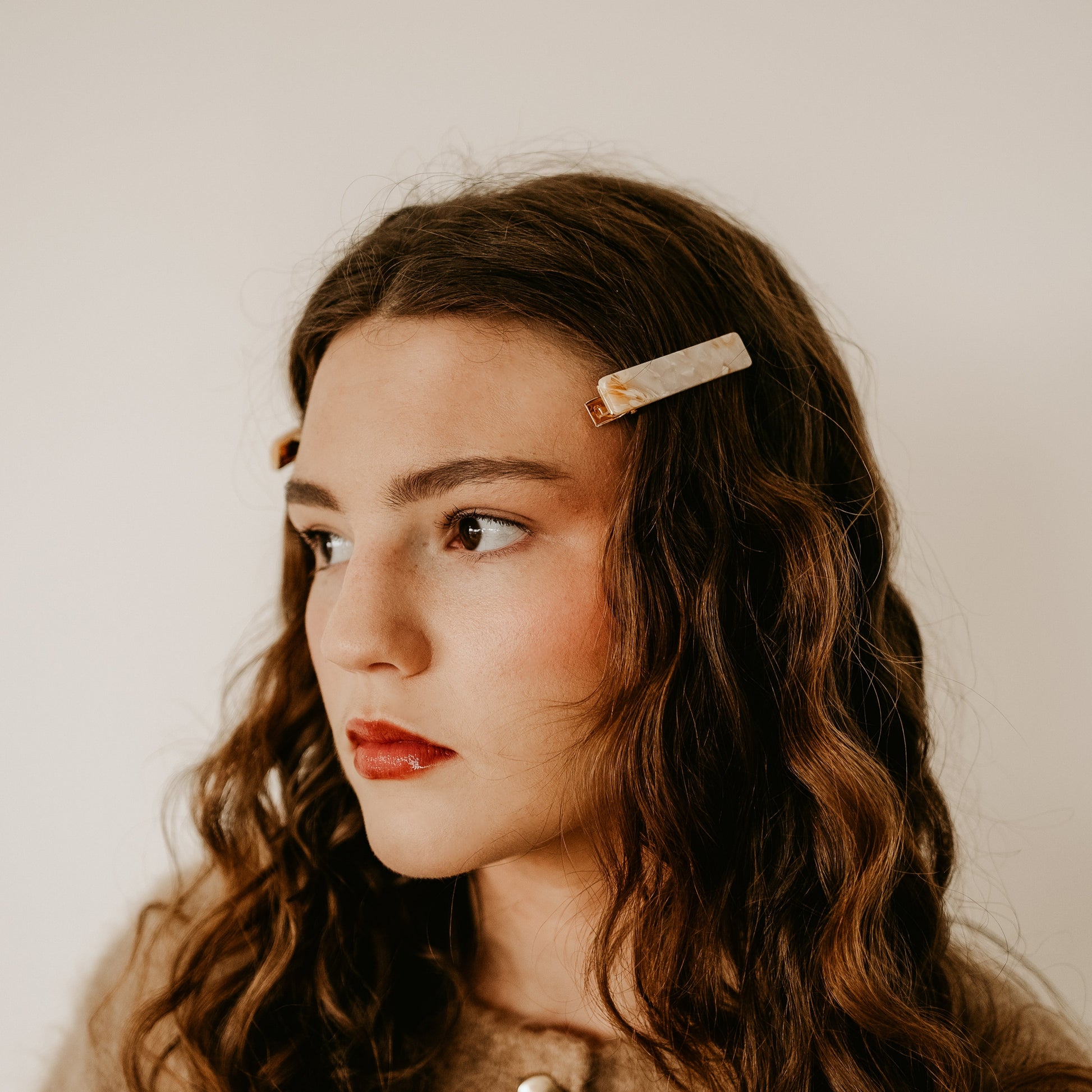 Hold your scarf in place with these cute acetate alligator clips in a cream and white marbled pattern