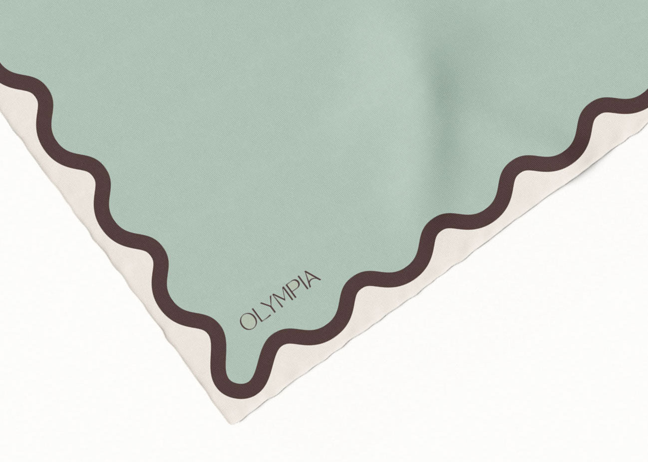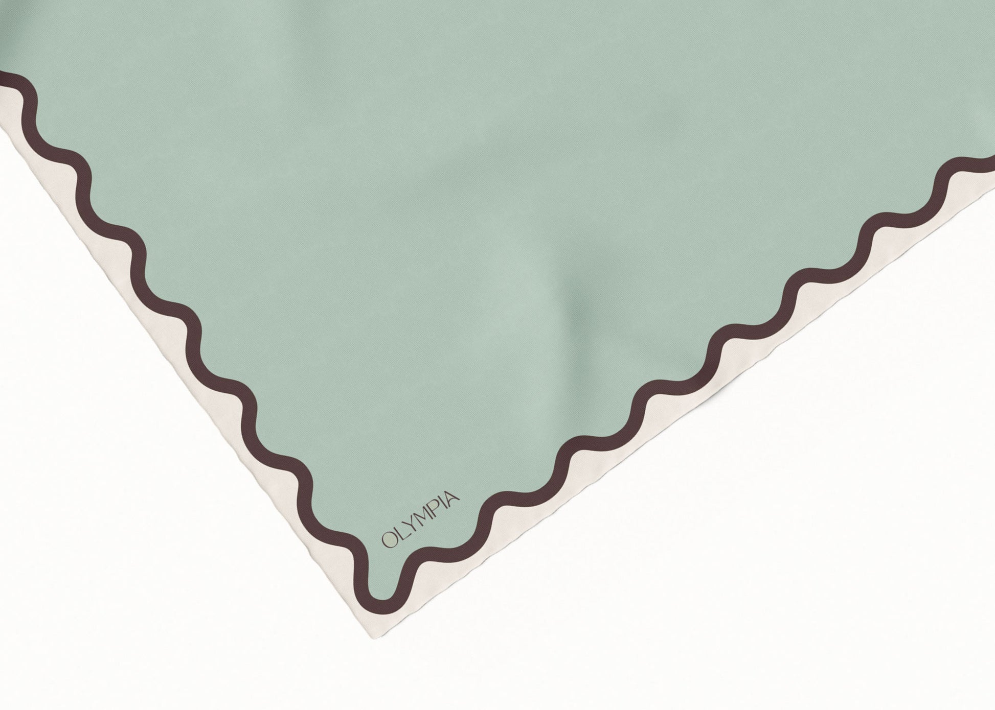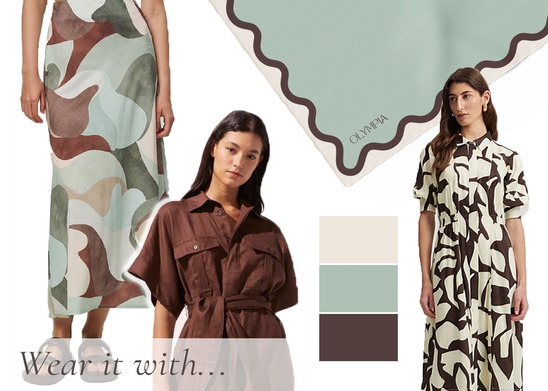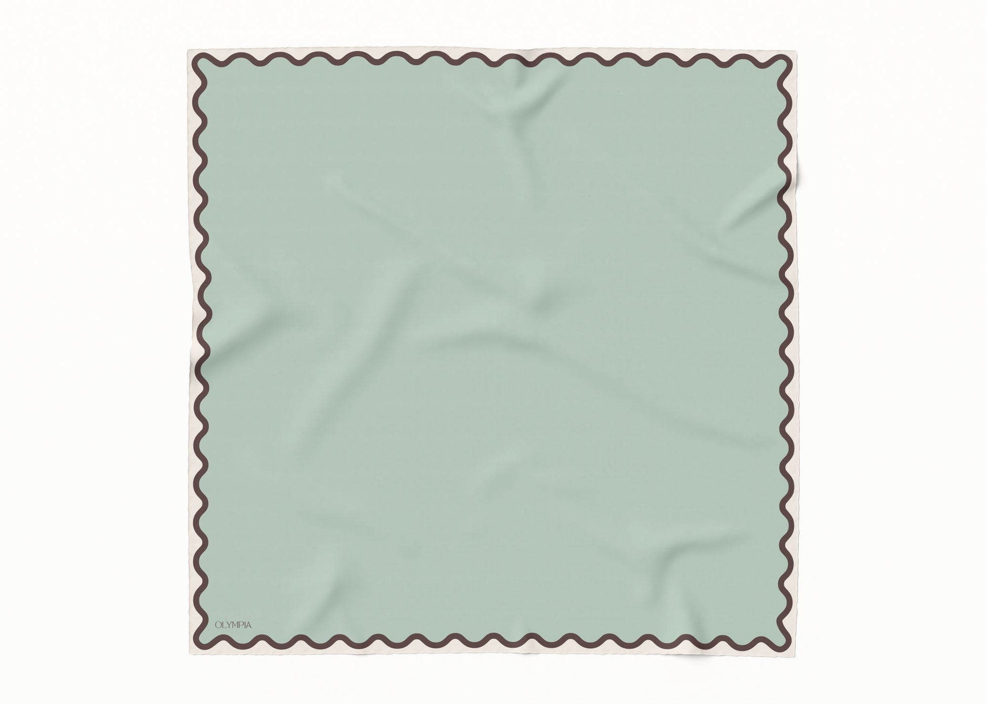 For those times when you need a plain scarf, but with a little something - Sophie's sister design Etta is another reliable option. This scarf features a muted grey-green background with a wide wavy border in dark brown, outlined by an off-white background