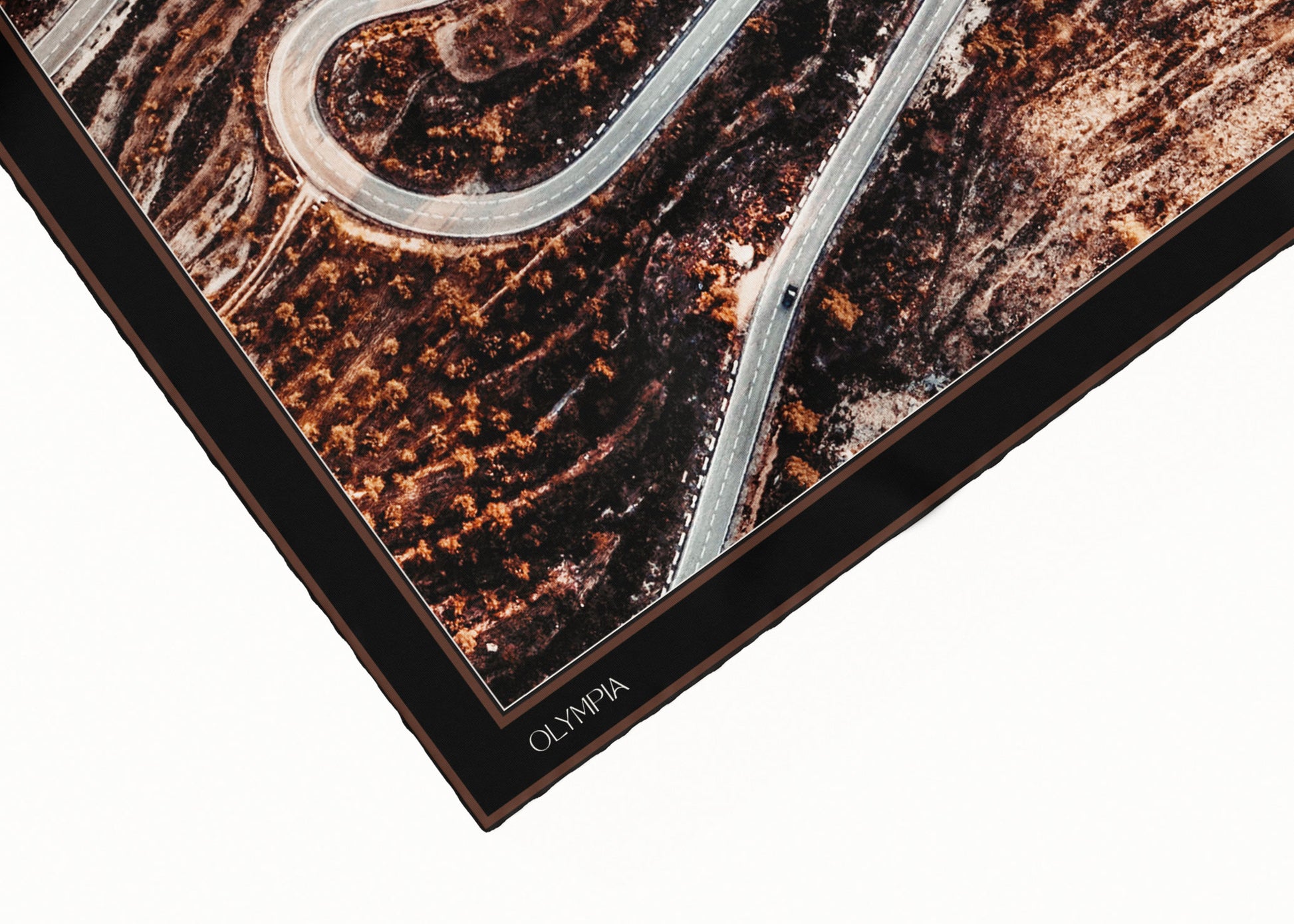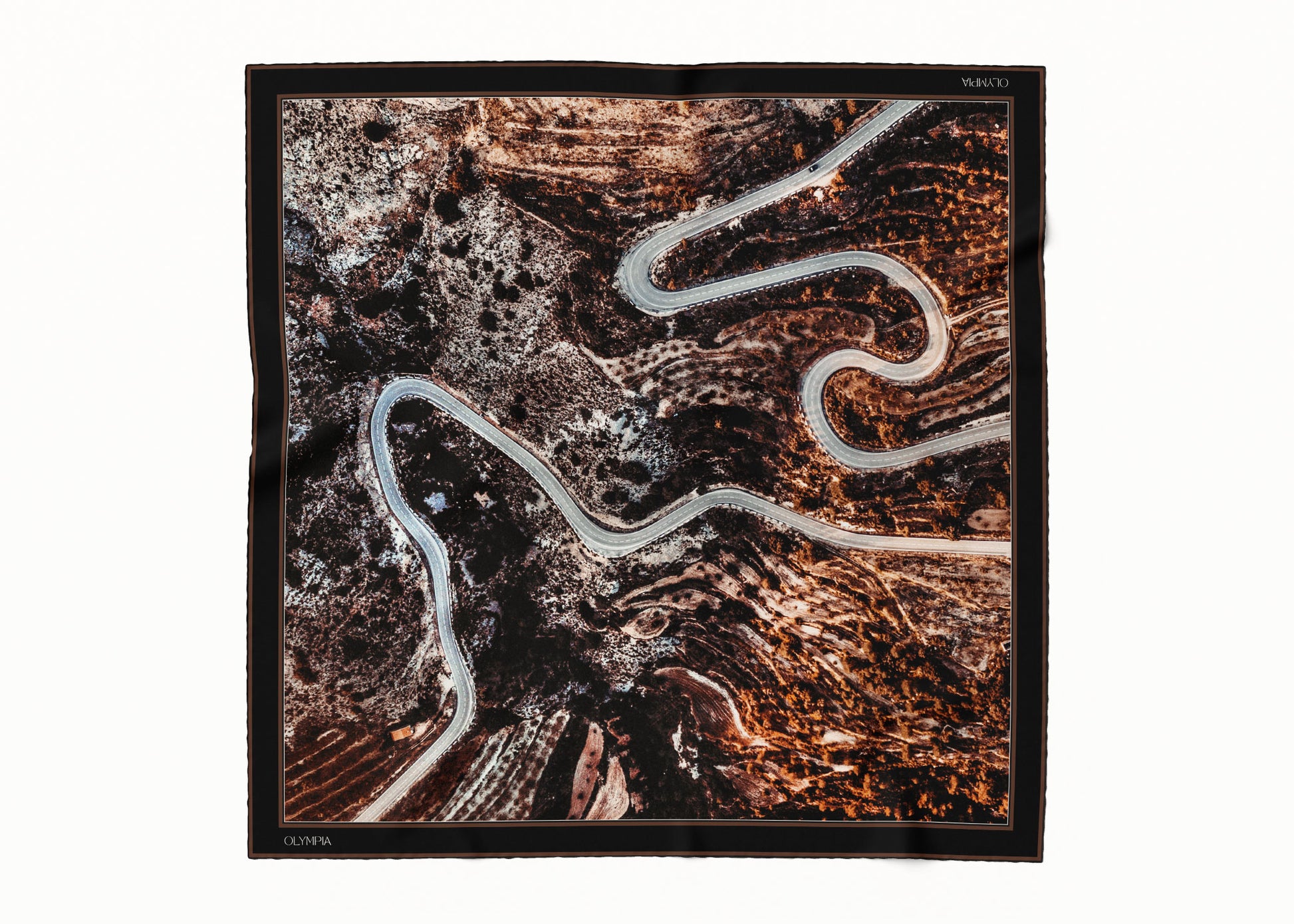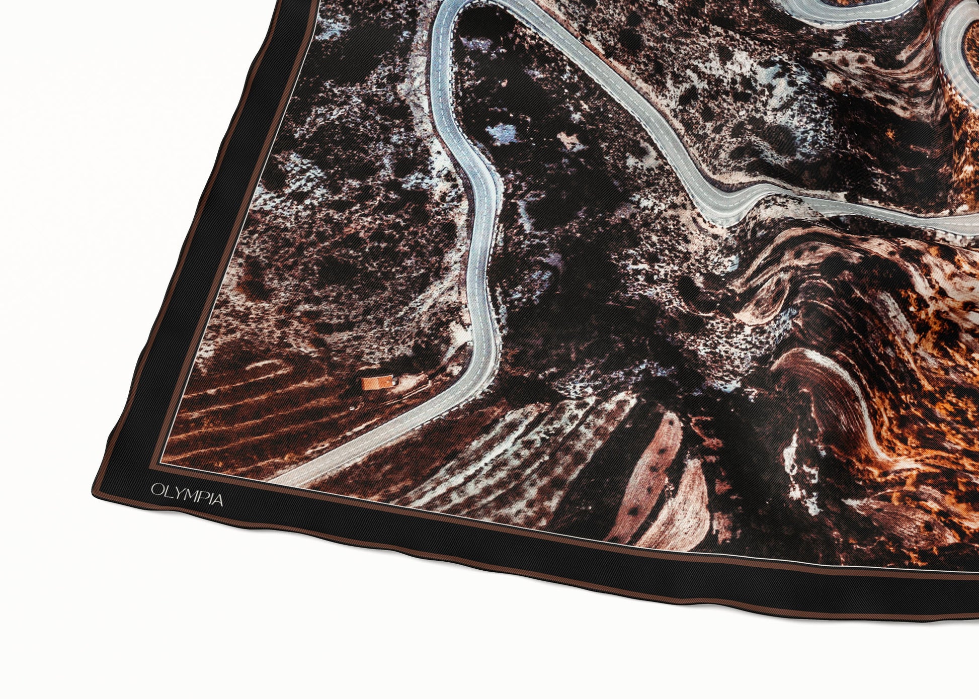 The Inez scarf depicts an aerial photograph of a winding road through a dark hillside. Colours featured in the scarf range from black, dark cocoa and tan, to grey, bronze and white. Perfectly on-trend and yet utterly timeless, this scarf will see you through many years to come