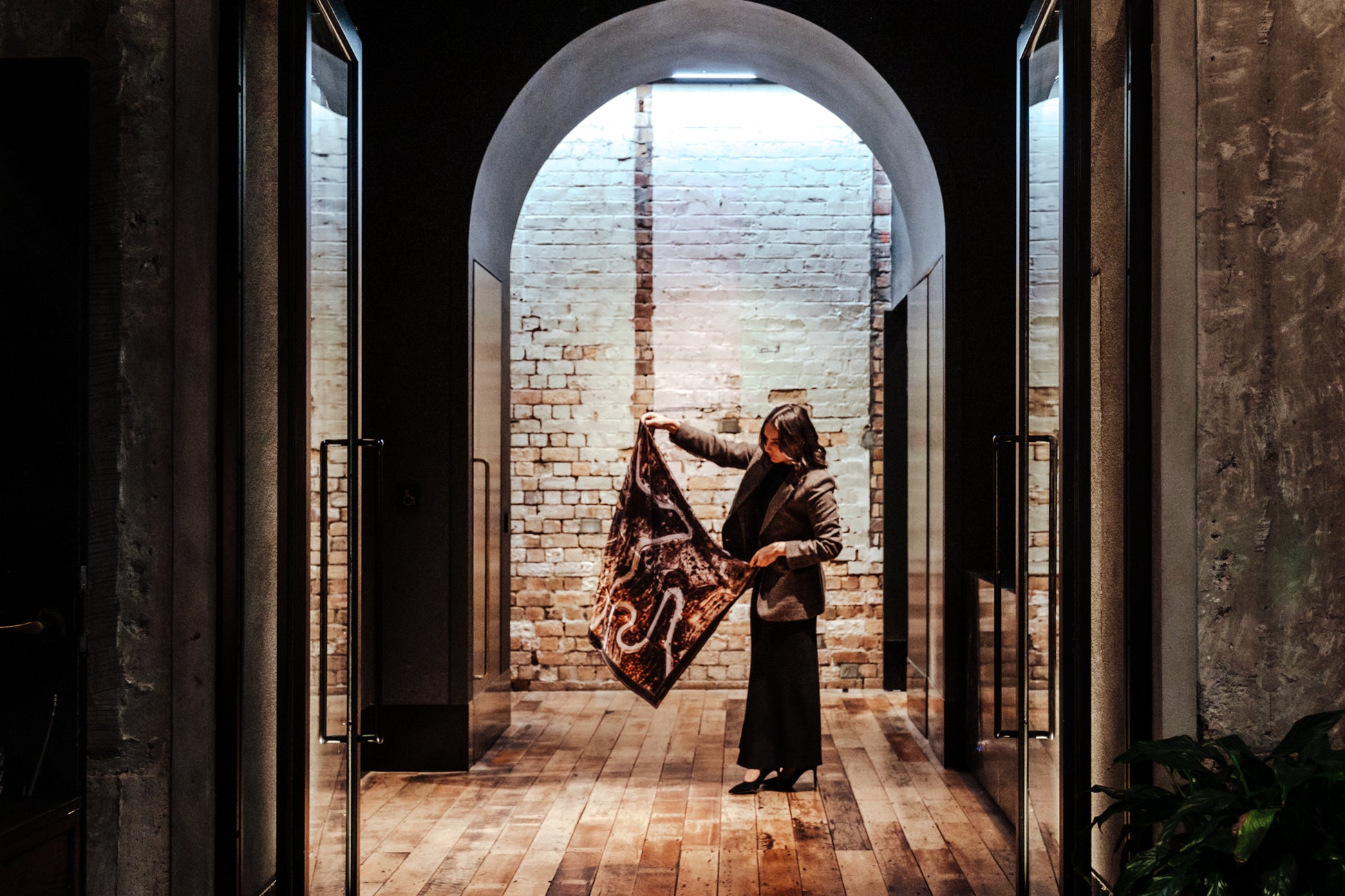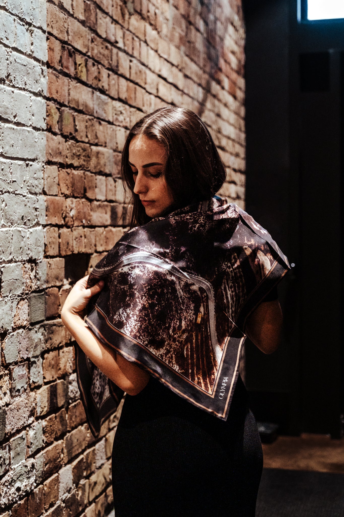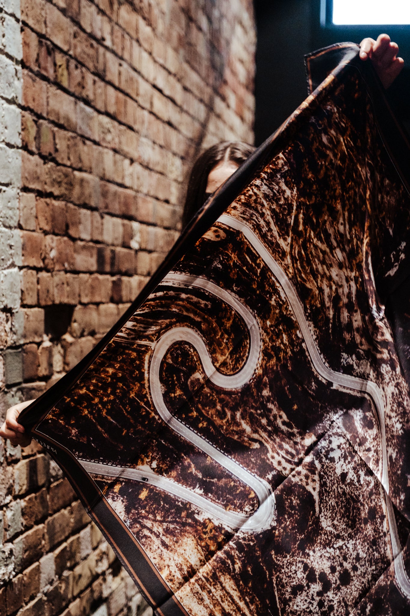 The Inez scarf depicts an aerial photograph of a winding road through a dark hillside. Colours featured in the scarf range from black, dark cocoa and tan, to grey, bronze and white. Perfectly on-trend and yet utterly timeless, this scarf will see you through many years to come