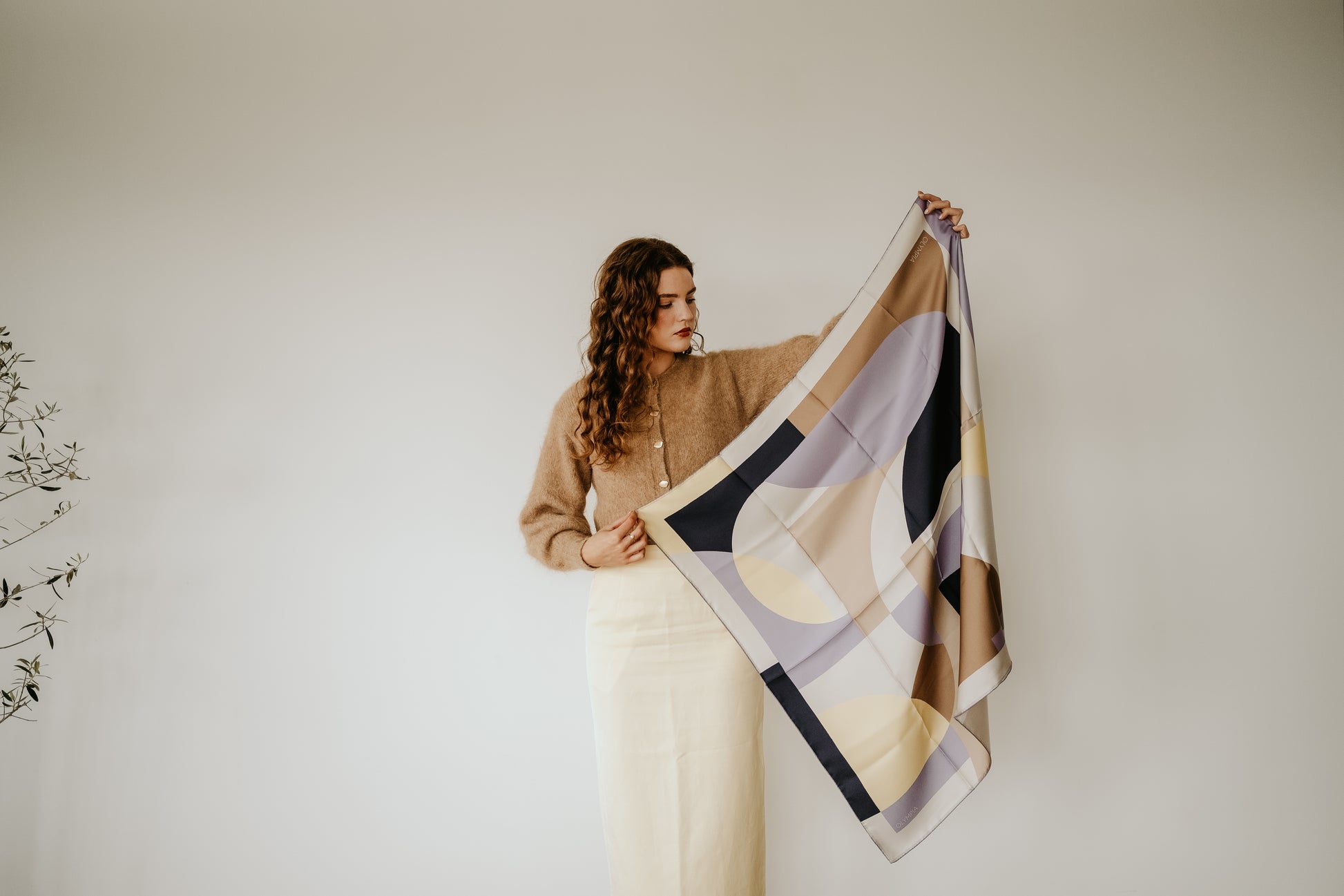 Enter Melba: A striking design featuring oversized, interwoven arches with an organic, hand-painted feel. Her gentle imperfect curves and tonal palettes draw inspiration from mid-century modern design, resulting in a scarf that’s beautifully simple—yet anything but boring.