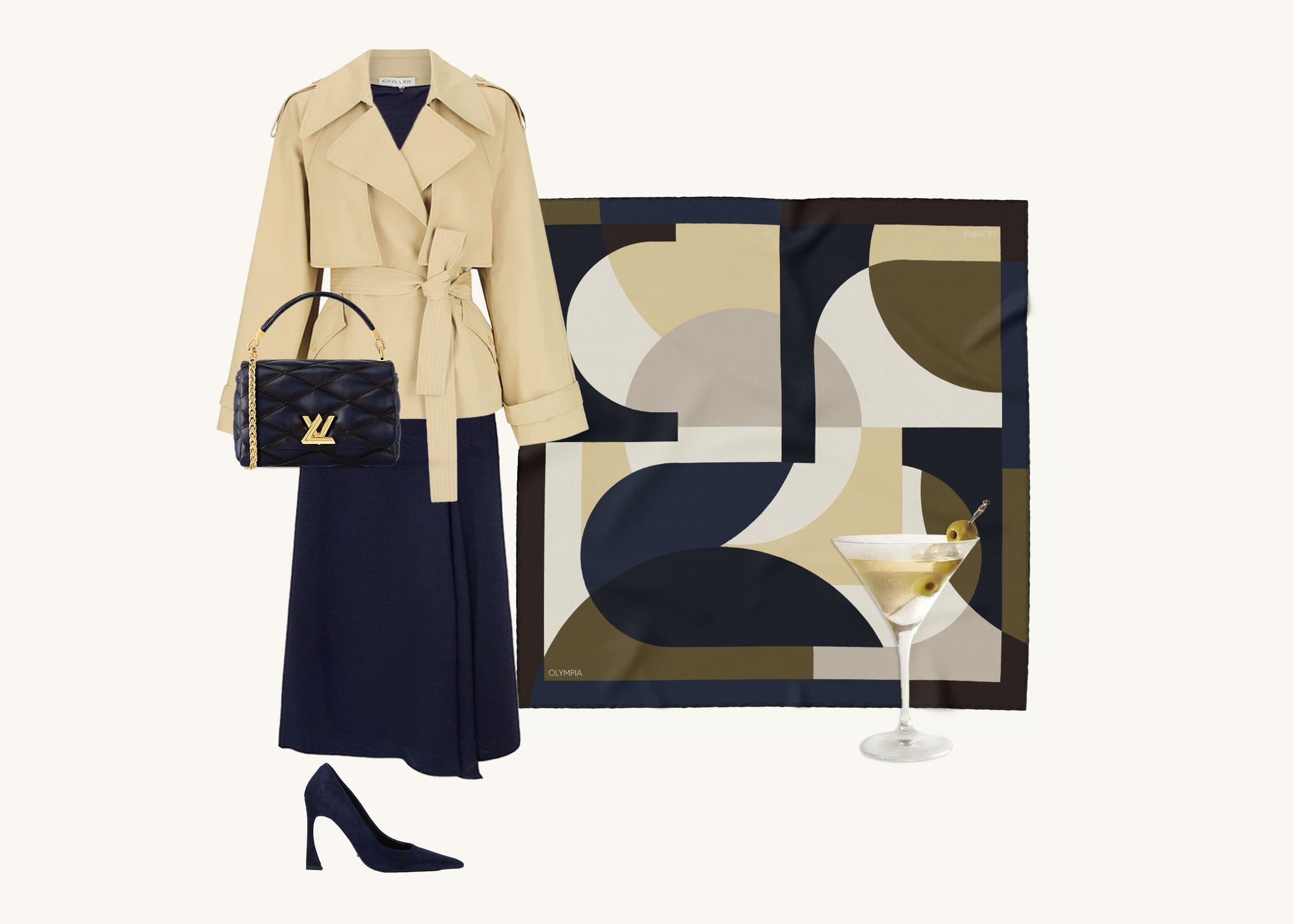 Melba Olive Martini feels bold and earthy, with a moody palette that balances rich olive and navy tones against soft beige and muted wheat. It evokes the quiet glamour of a classic cocktail lounge — understated, sultry, and timeless.