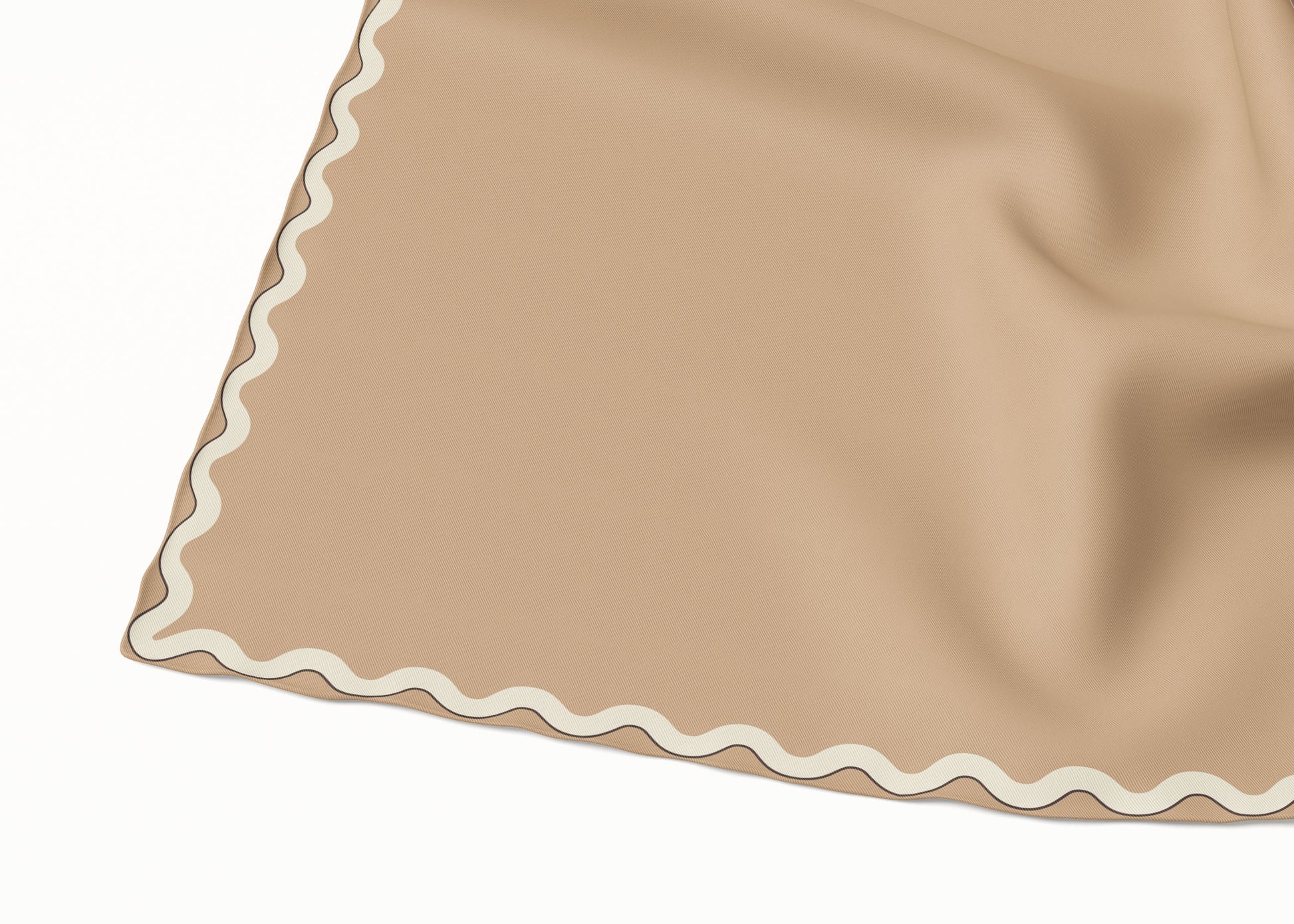 This scarf features a camel background with a wide wavy border in cream. The border's outer edge is framed in a dark brown - the contrast making the colours pop