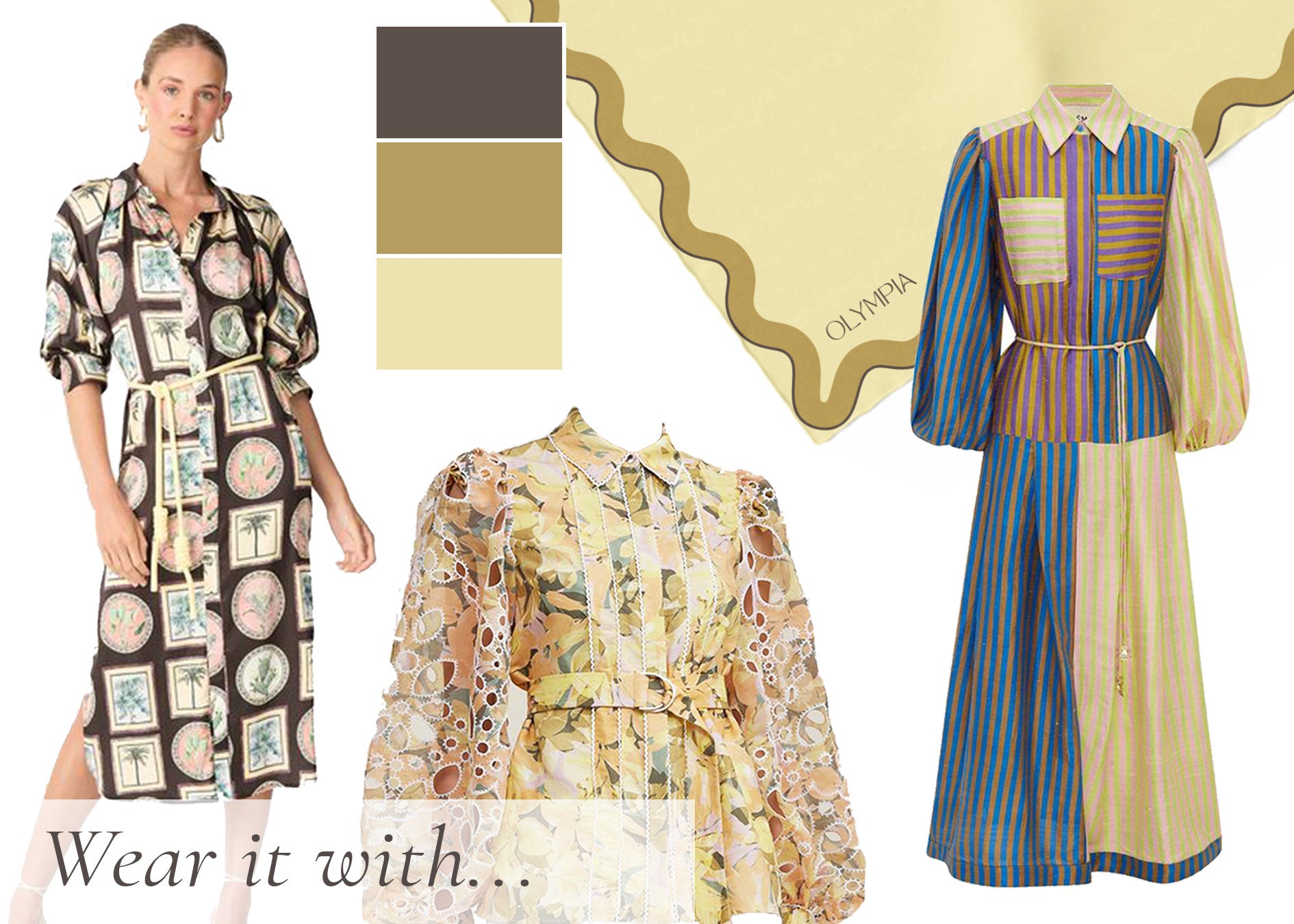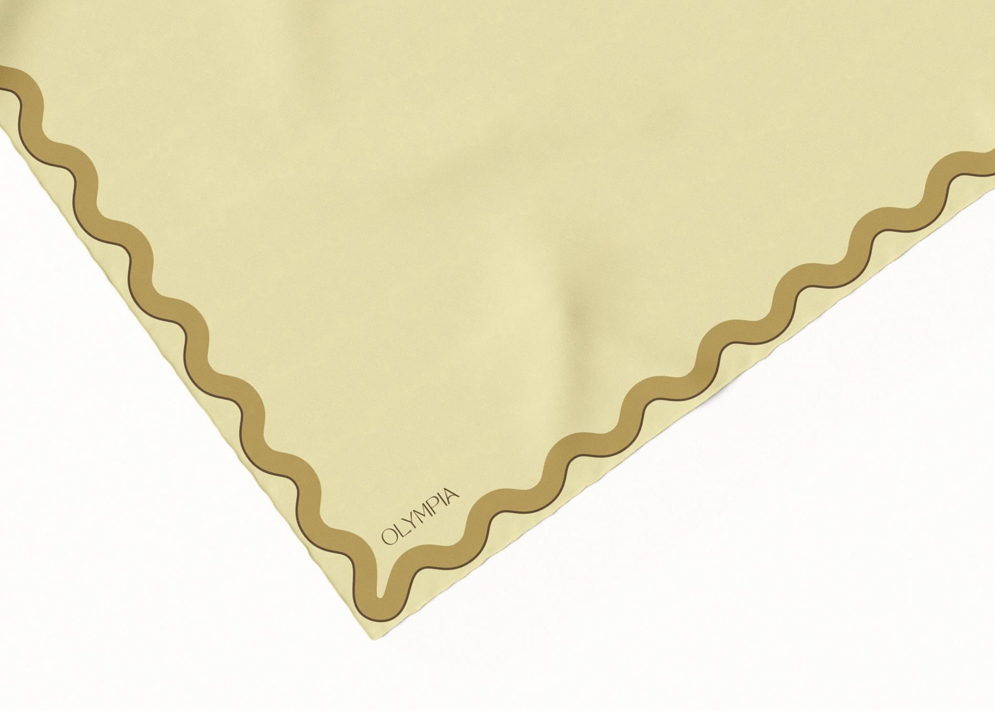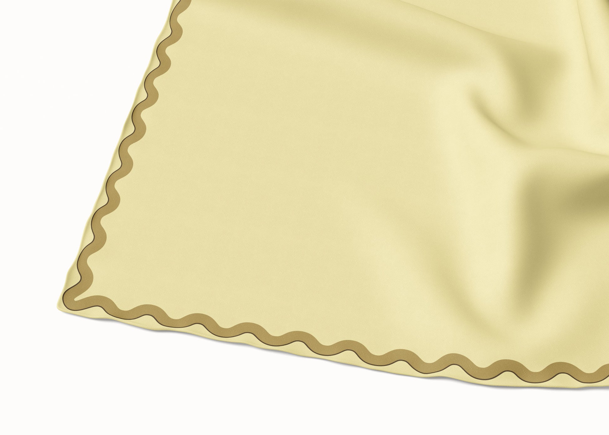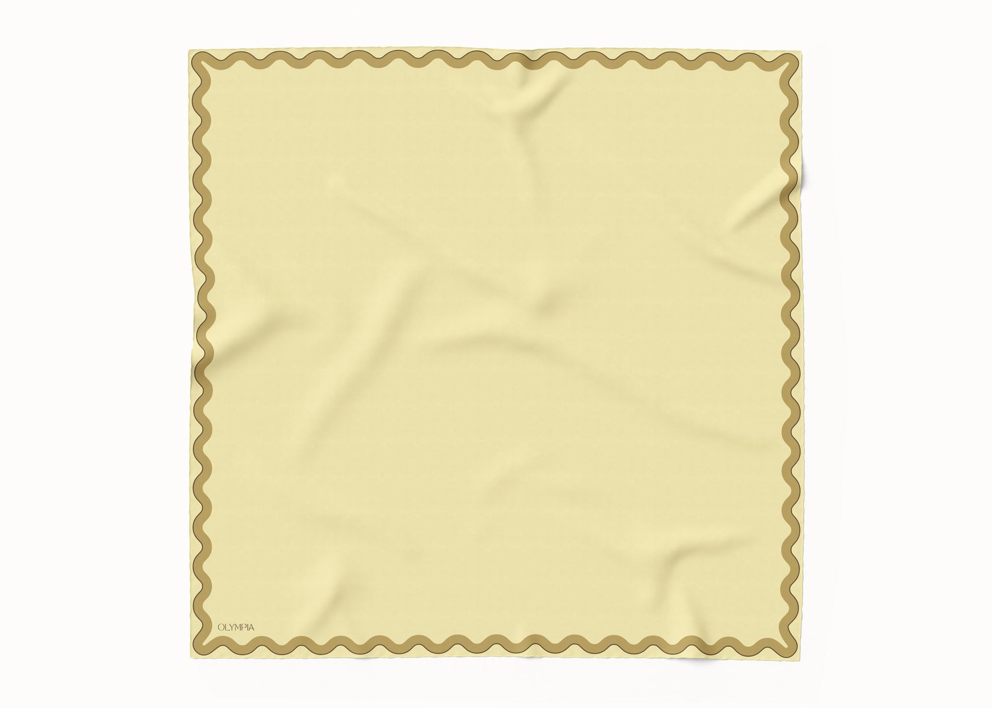 For those times when you need a plain scarf, but with a little something - Sophie is your go-to. This scarf features a soft yellow background with a wide wavy border in antique gold. The border's outer edge is framed in a dark brown - the contrast making the colours pop