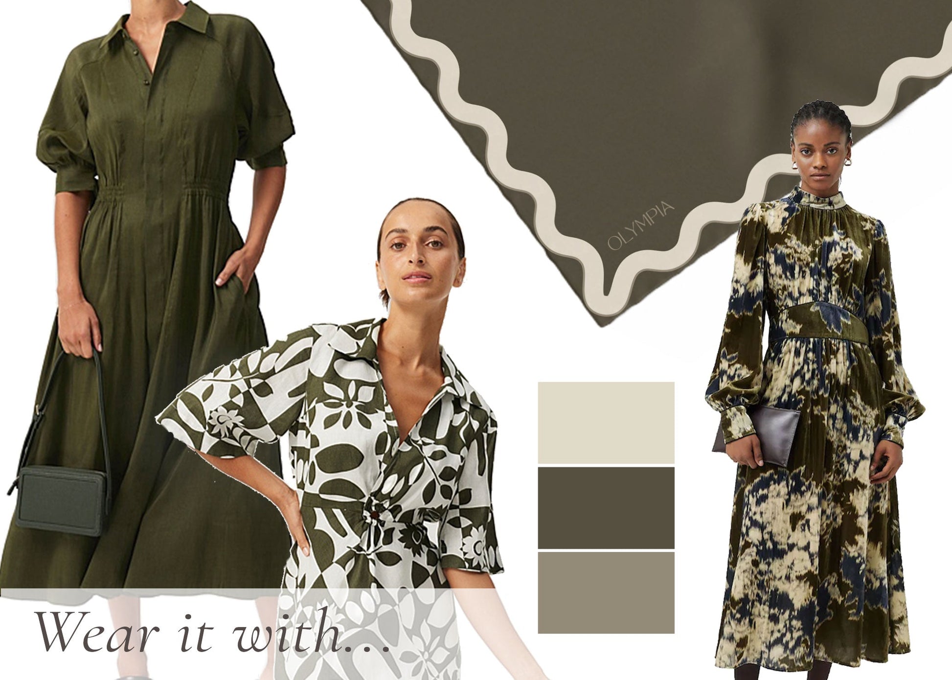 Sophie Olive Night features a deep olive-green background with a wide wavy border in cream. The border's outer edge is framed in a silvery sage colour - the contrast making the colours pop