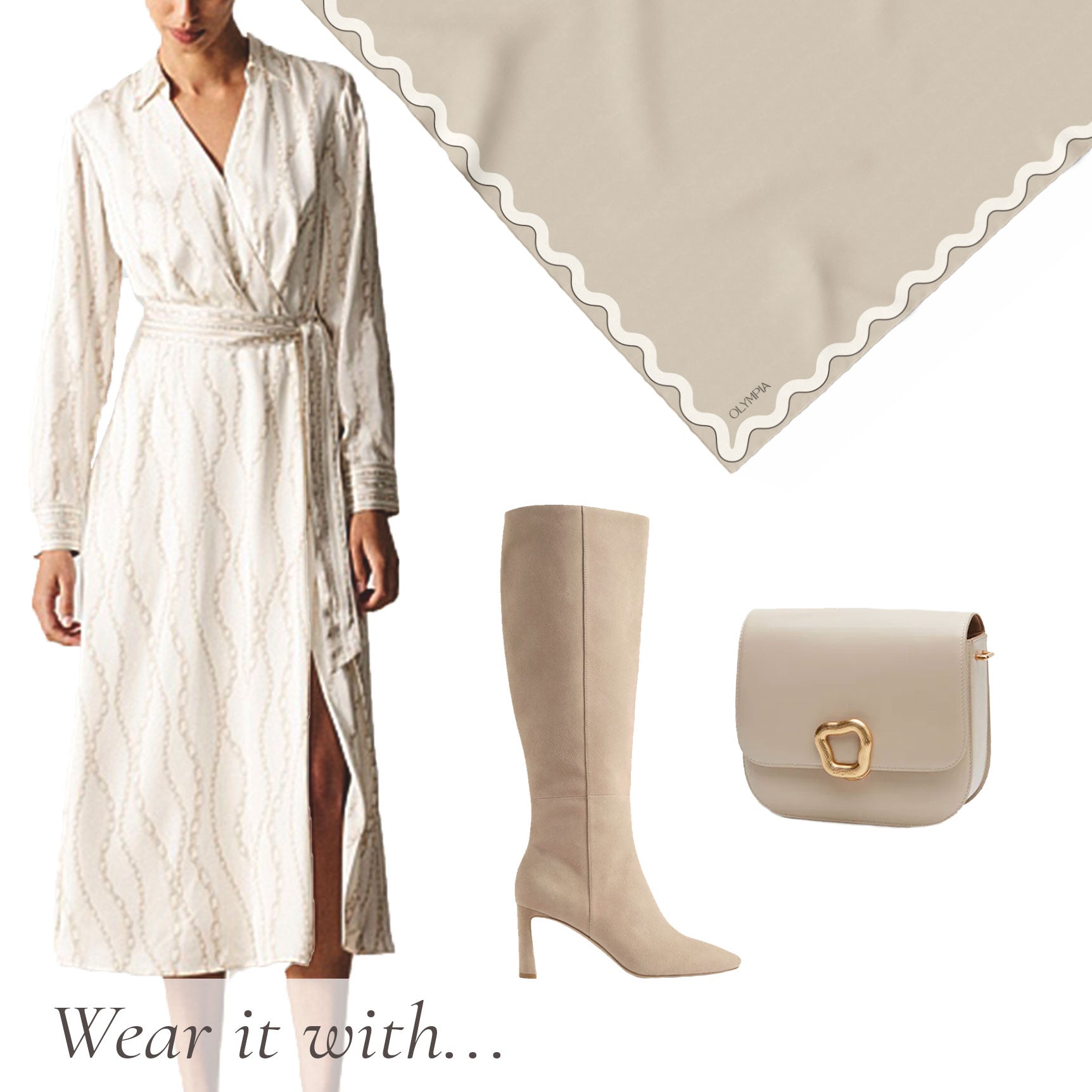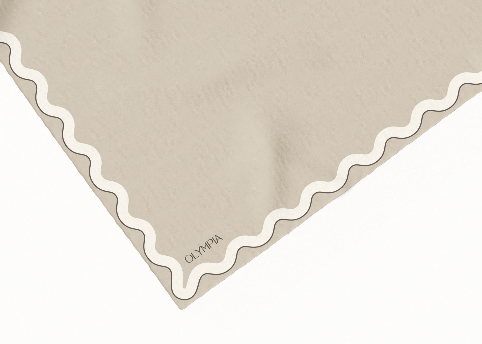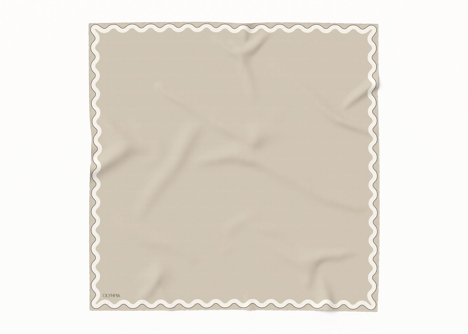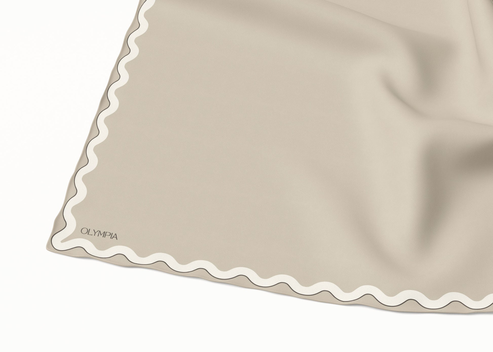 For those times when you need a plain scarf, but with a little something - Sophie is your go-to. Sophie Pussywillow features a light beige-grey background with a wide wavy border in off-white. The border's outer edge is framed in a muted grey-brown - the contrast making the colours pop