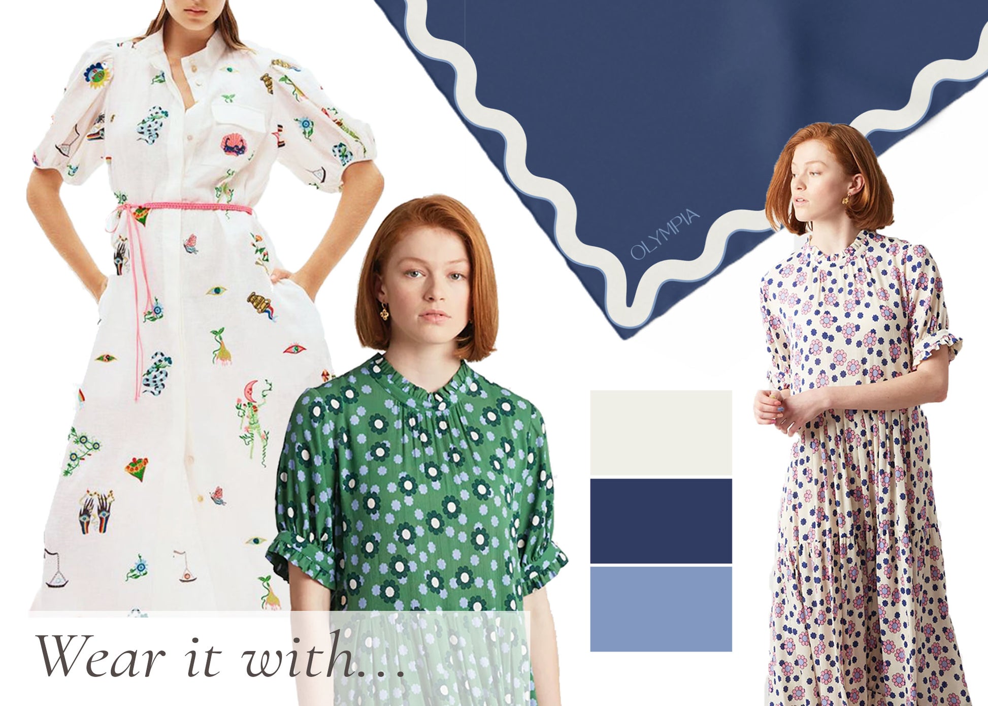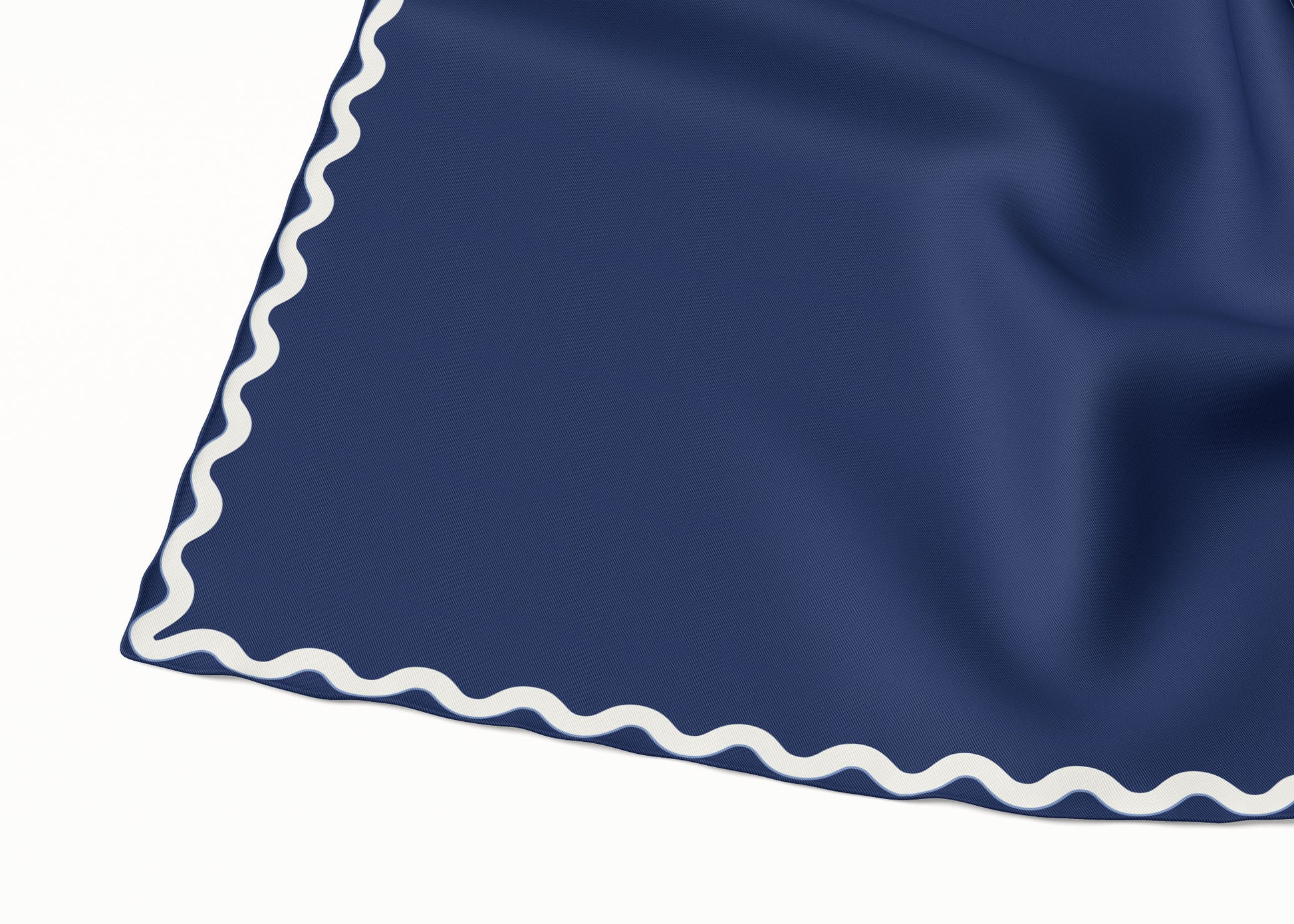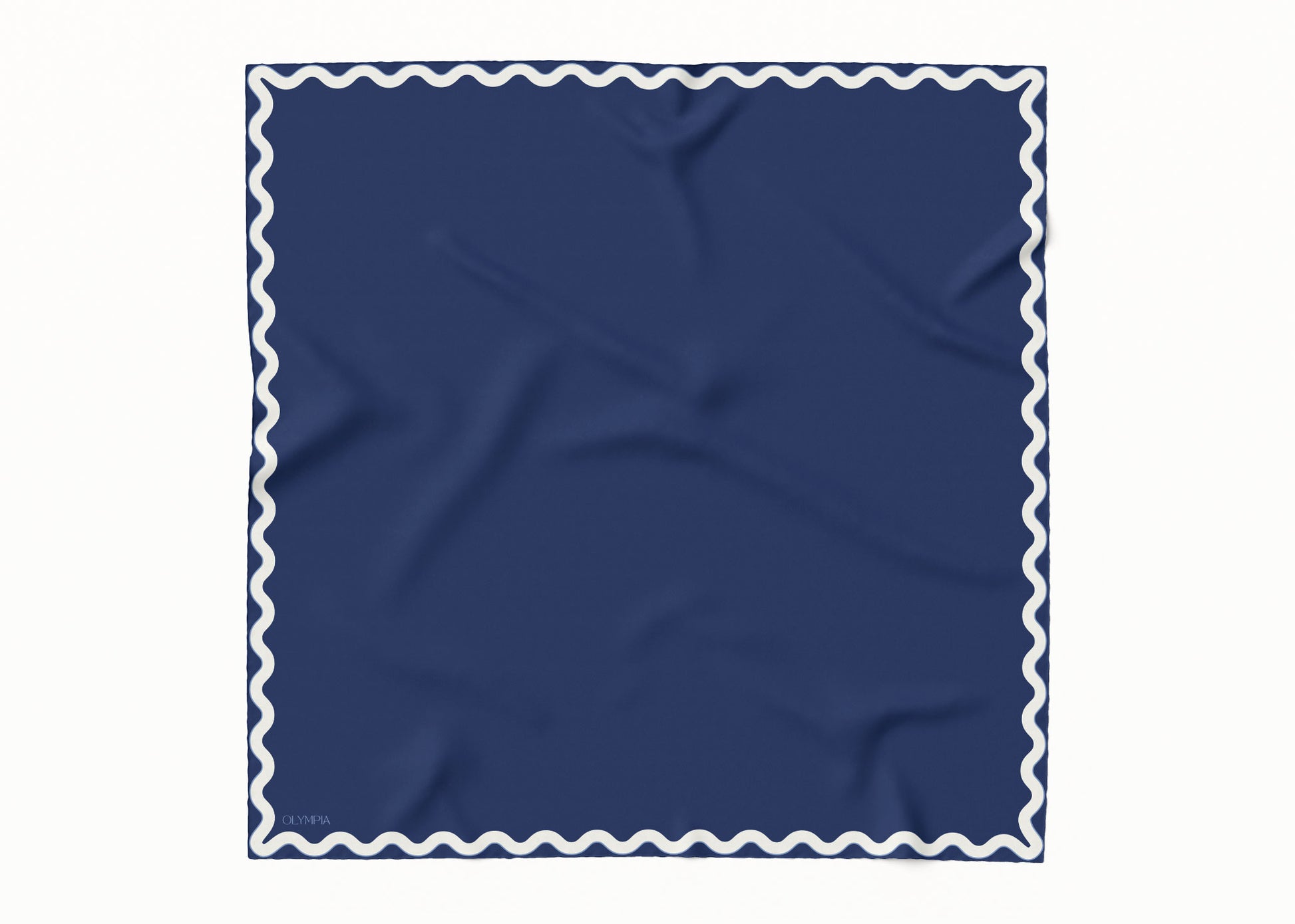 For those times when you need a plain scarf, but with a little something - Sophie is your go-to. This scarf features a dark sapphire-blue background with a wide wavy border in dove white. The border's outer edge is framed in a pale blue - the contrast making the colours pop