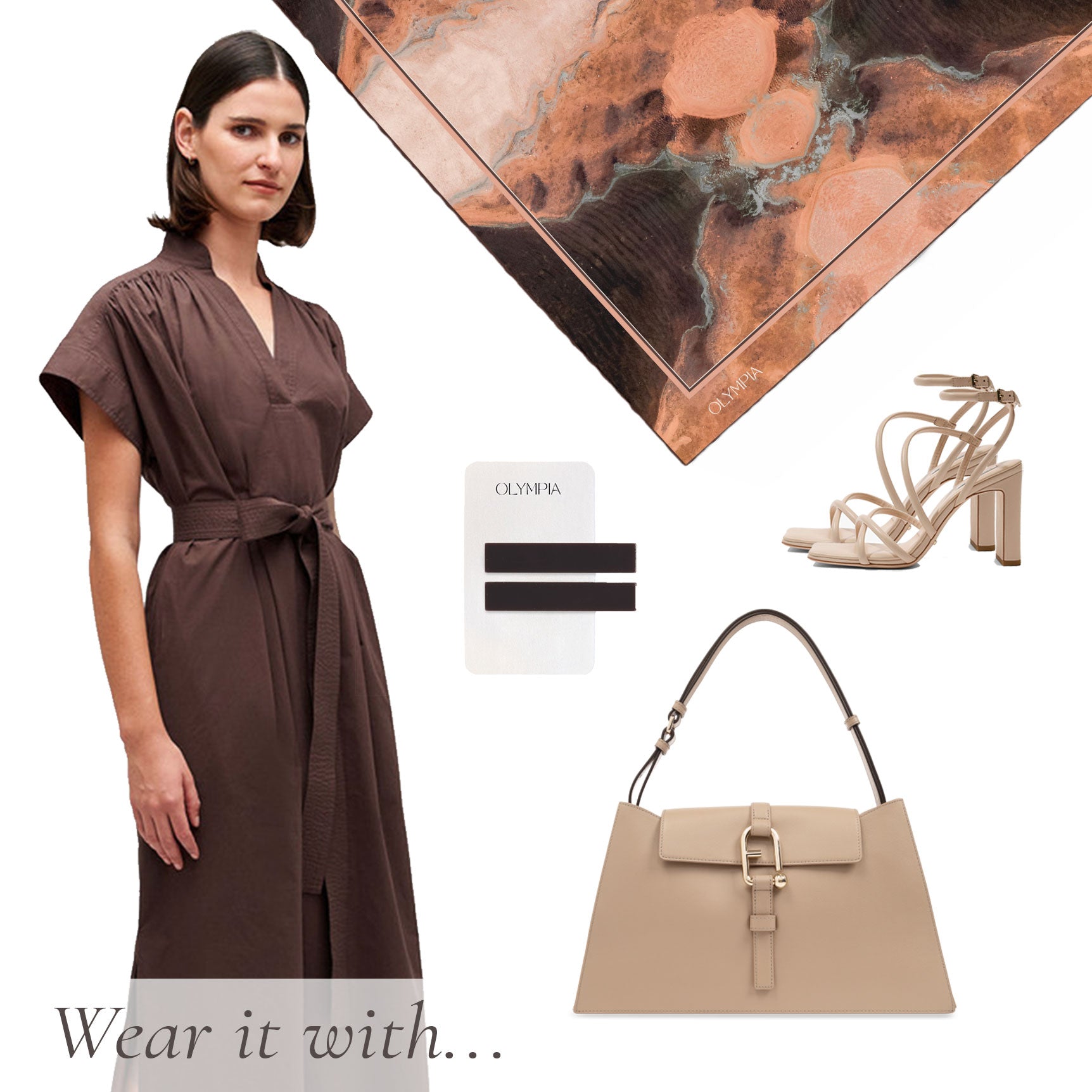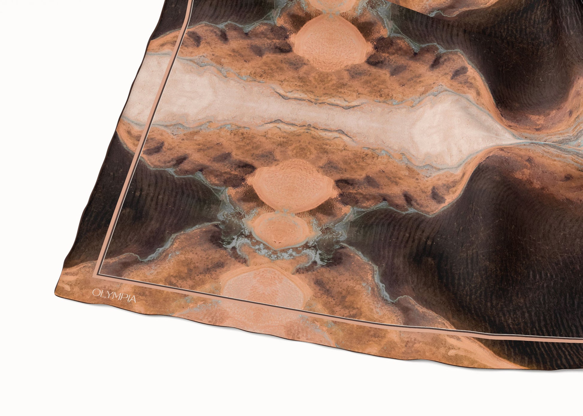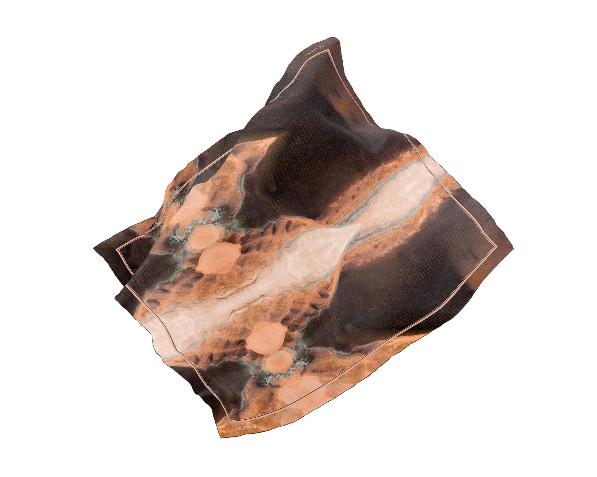Introducing Winona, a limited-edition silk scarf featuring a captivating tessellated image of a sandbar from above. With a colour palette ranging from pale peach, copper and rust, through to pale blue, silver and dark brown, this scarf will add texture and interest to any outfit.